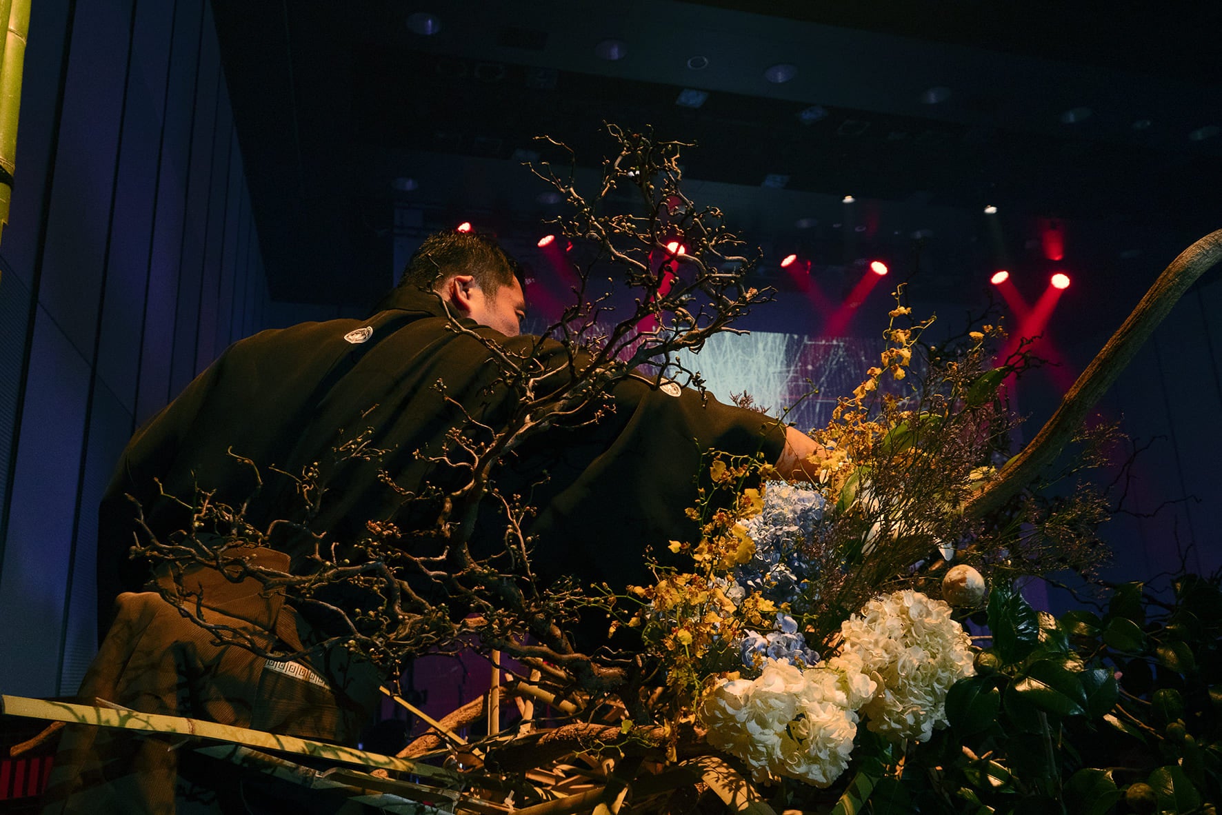 バンド演奏中に巨大生け花作品を完成させるパフォーマンス。観客はその手際の良さとダイナミックさに圧倒された。