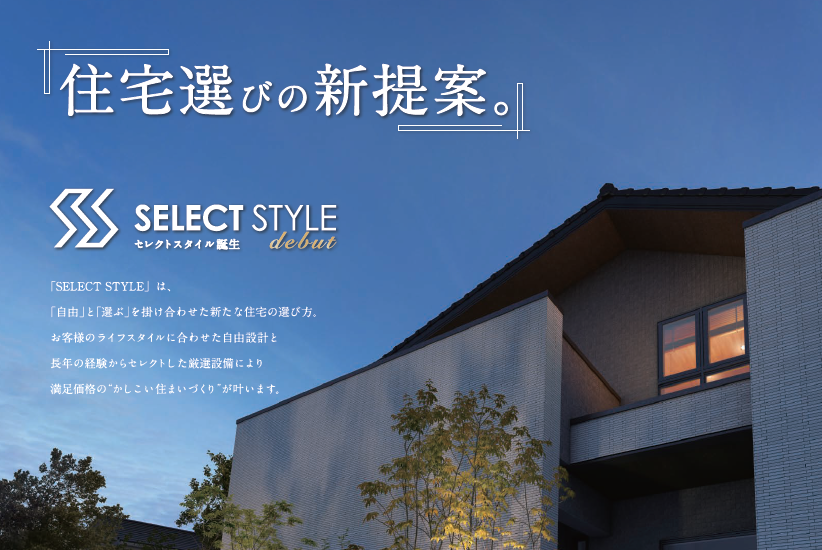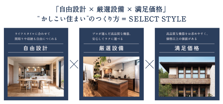 注文住宅を建てるには、お客様にとって多大な時間や手間、コストが必要なため、大きなハードルを感じる方たちが多くなっています。そこで、こうした注文住宅の課題を解決し、高品質な住まいを叶えることができるのが「SELECT STYLE」です。自由設計で、設備・仕様はプロが厳選したアイテムから選ぶことができ、お求めやすい価格も実現した、“かしこい住まい”のつくり方です。