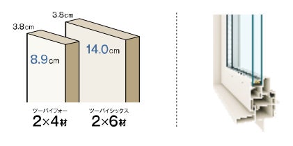 外壁の枠組に骨太な2✕6材を仕様。耐震性が向上するだけでなく断熱性や遮音性もアップします。 樹脂フレームとLow-E複層ガラスで国内最高レベルの断熱性能。