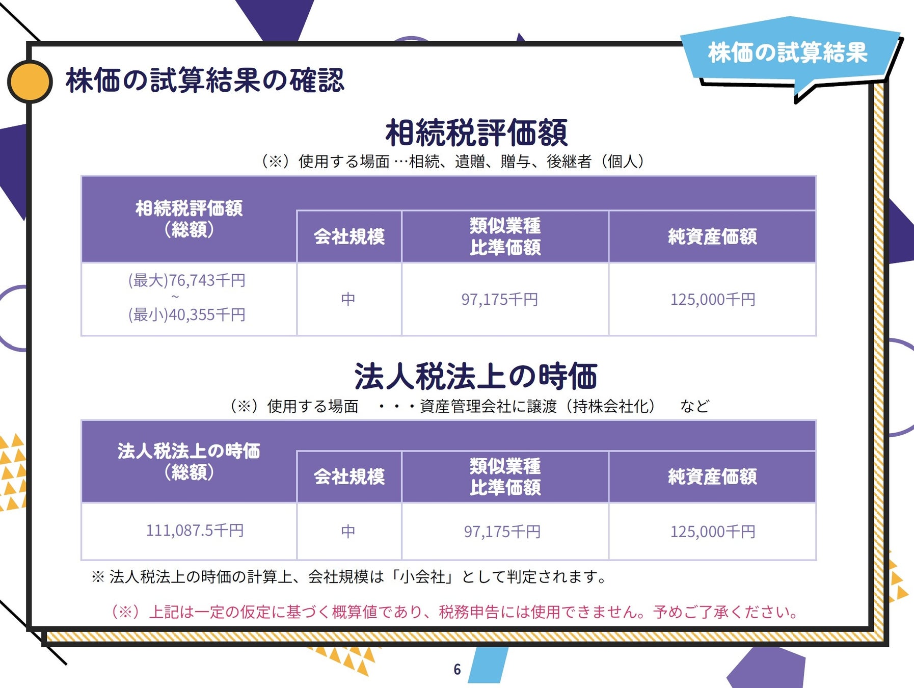 会社の決算情報をプルダウンで入力すれば、事業承継に強い税理士が初回のディスカッションに持参するレベルの報告書が完成します。こちらは有料サービスです。