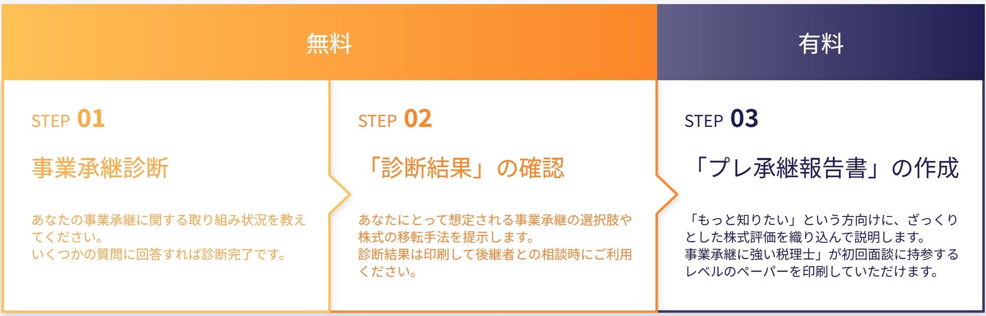 STEP.2まで匿名・無料で実施が可能、想定される事業承継プランがPDFデータにて提供されるため、事業承継を進めるきっかけとしてご活用いただけます。