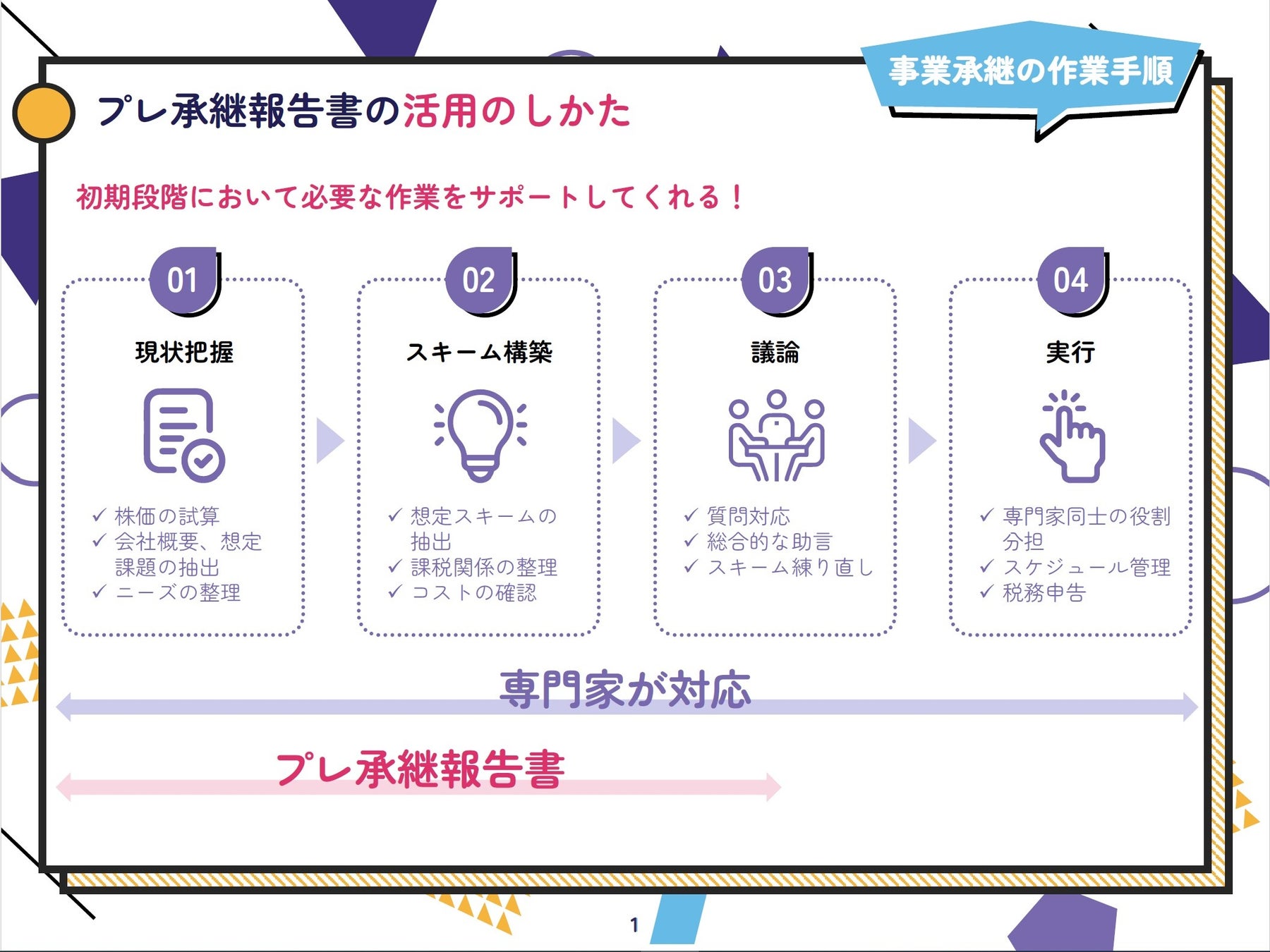 web上で「診断結果」(無料)や「プレ承継報告書」(有料)を作成いただけましたら、いよいよ具体的に事業承継に取り組んでいくことになります。