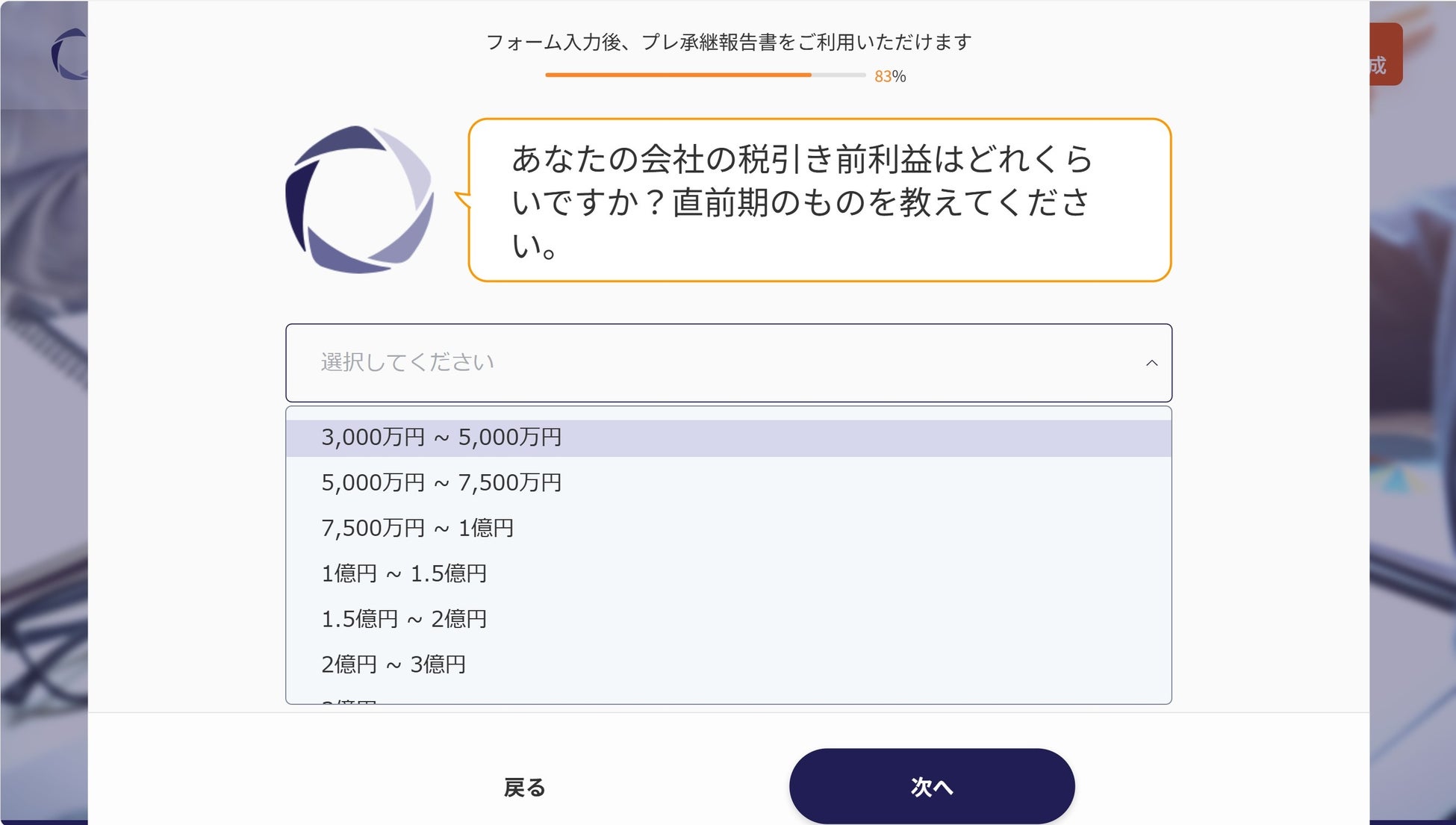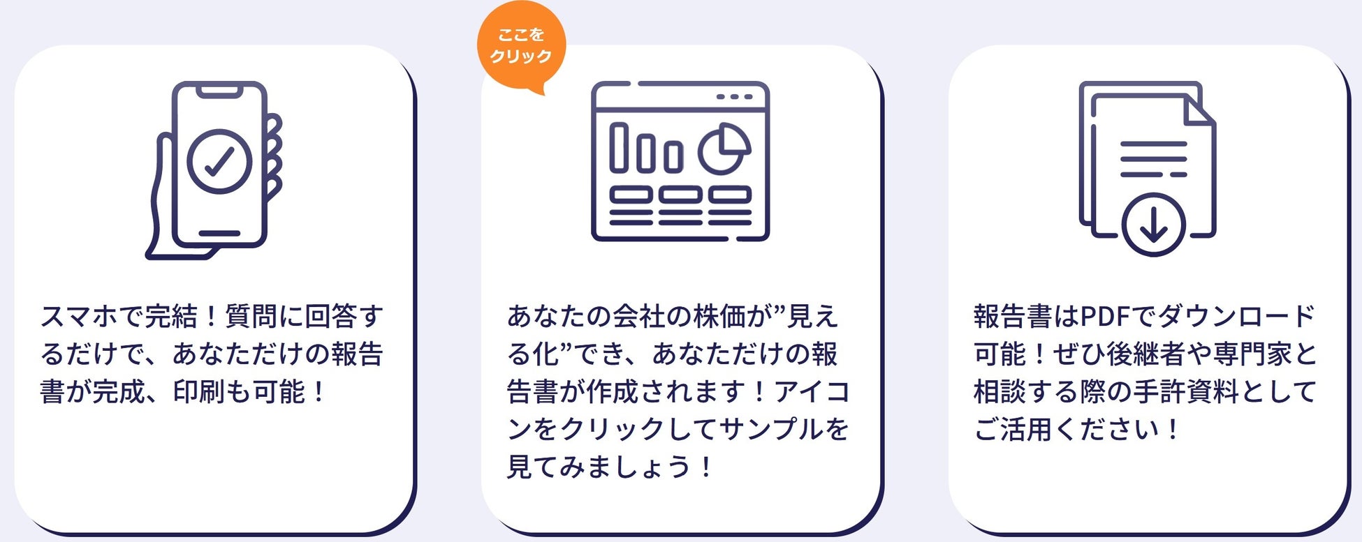 簡単な質問にプルダウン形式で回答していくだけで、あなたの会社に合った事業承継プランが提供されます。最短で3問の質問に回答するだけ、かつ手元に会社の決算書等が無くとも回答できる、気軽に触れられるサービスです。