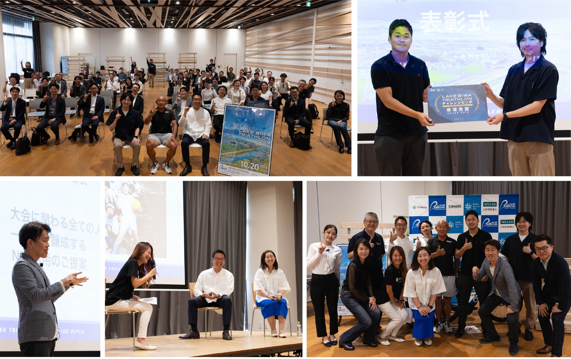 守山市との官民連携による取り組みの1つとして、7月には、LAKE BIWA TRIATHLONを舞台に、世界に誇る大会の実現、琵琶湖周辺での官民連携による受入環境整備に向けて、社会を変革する新しい技術・サービスを持つスタートアップからの企画提案を募集するピッチコンテスト「LAKE BIWA TRIATHLONチャレンジピッチ」を株式会社COMARS、Creww株式会社とともに実施しました。