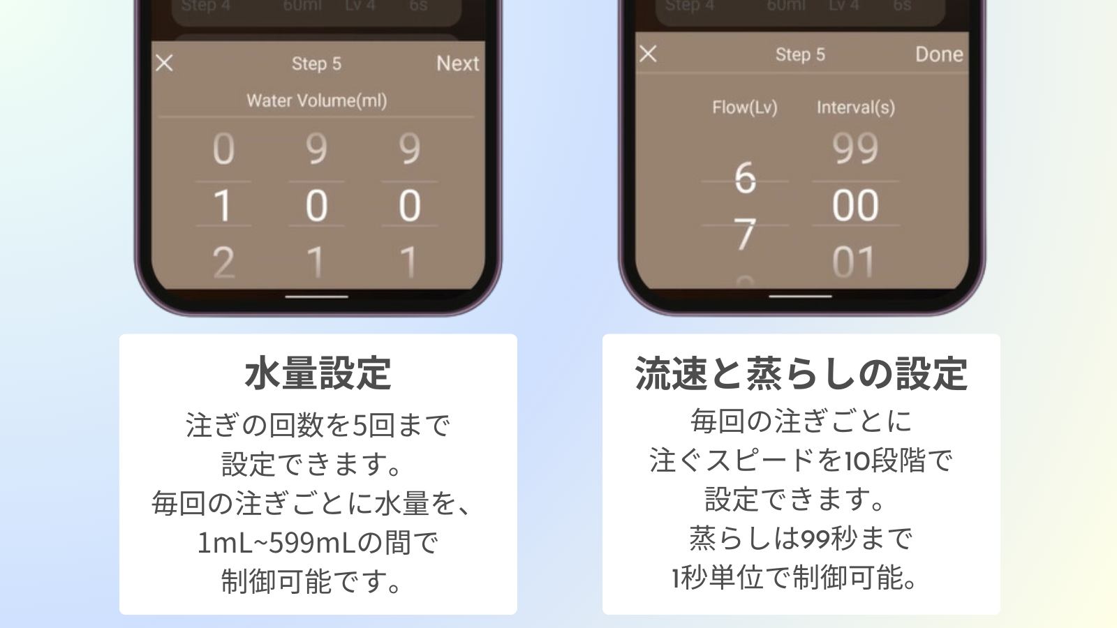 Hikaruでは流速は10段階で調整が可能です。5つ穴のシャワー式の注湯口からの、流量を設定することで、コーヒー粉の攪拌の度合いを設定できます。