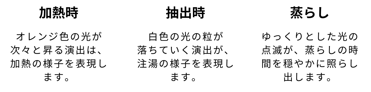 円形の本体には、LEDライトが内蔵しており、抽出の過程を幻想的にライトアップします。ガラスに反射する光と、落ちていくコーヒーの色まで視覚的にお愉しみいただけます。