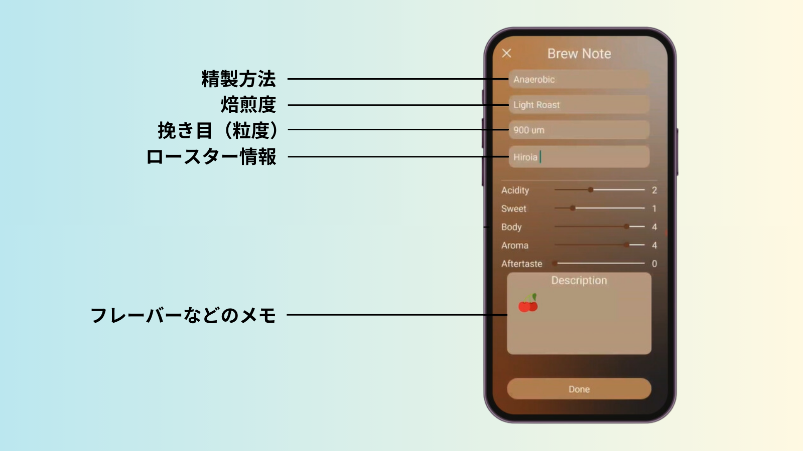 レシピ作成機能では、オリジナルの抽出レシピを作成することができます。水温・水量・流速・蒸らし時間のカスタマイズを行い、ライブラリーに保存できます。作成したレシピには、使用した豆の情報や、フレーバーの情報を記入することが可能です。