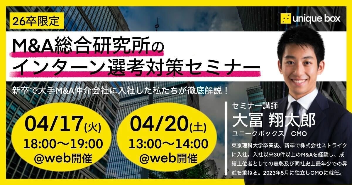 今回は、新卒のM&A業界支援実績No.1である弊社は、新卒で大手M&A仲介会社ストライクに入社した経歴を持つ、ユニークボックスの経営陣2名が設立した、M&A仲介会社特化型の就活支援会社です。今回のセミナーでは、M&A総研に特化したセミナーを開催します。