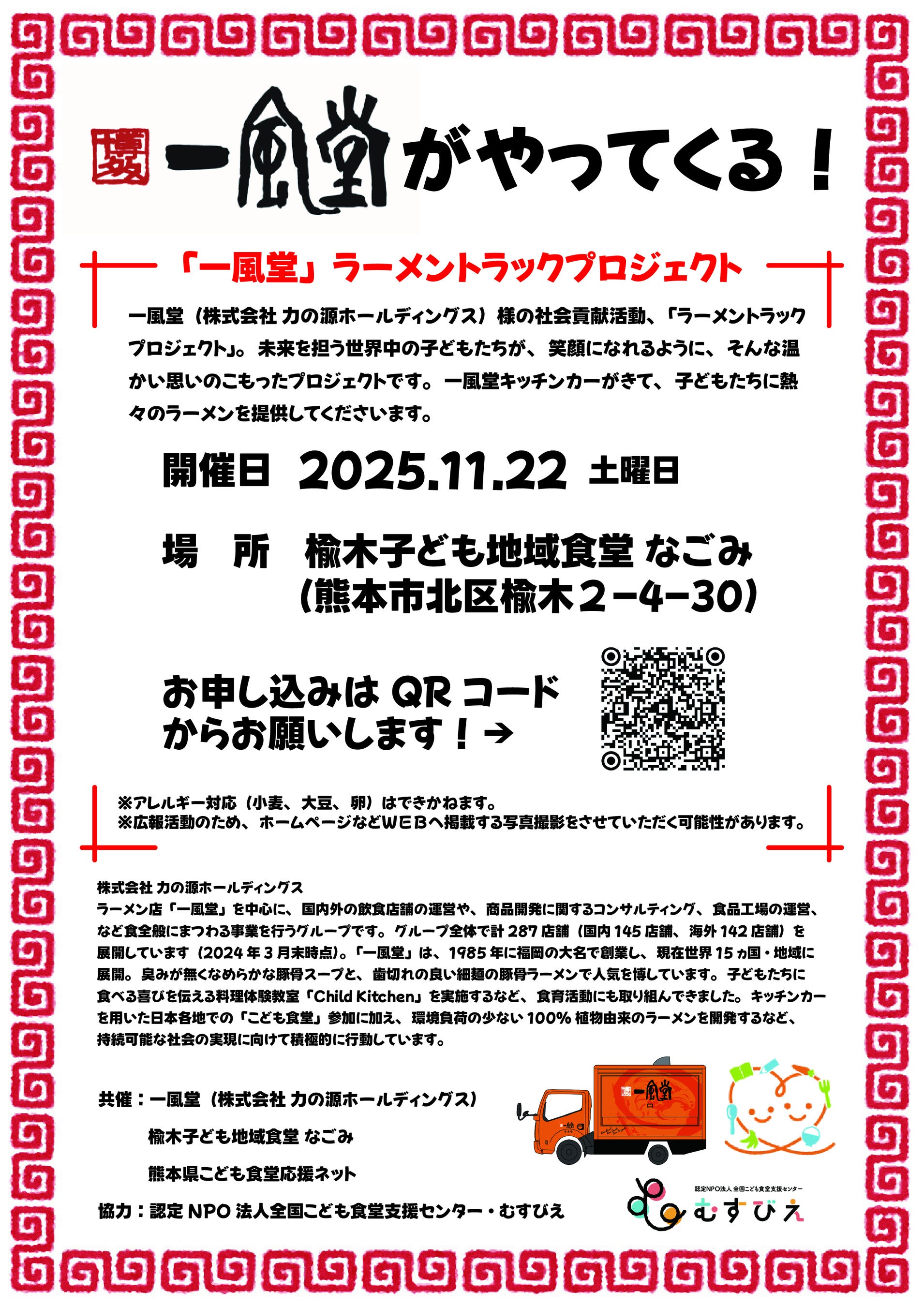 かい思いのこもったプロジェクトです。一風堂キッチンカーがきて、子どもたちに熱