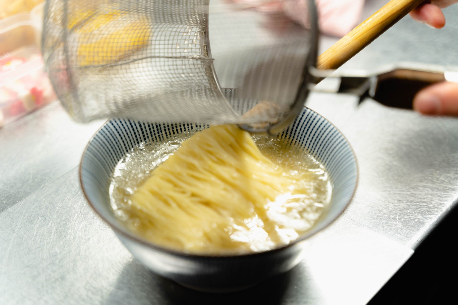 麺 美しい麺線を描く細麺は灯花スープのためだけに開発した特注ストレート麺