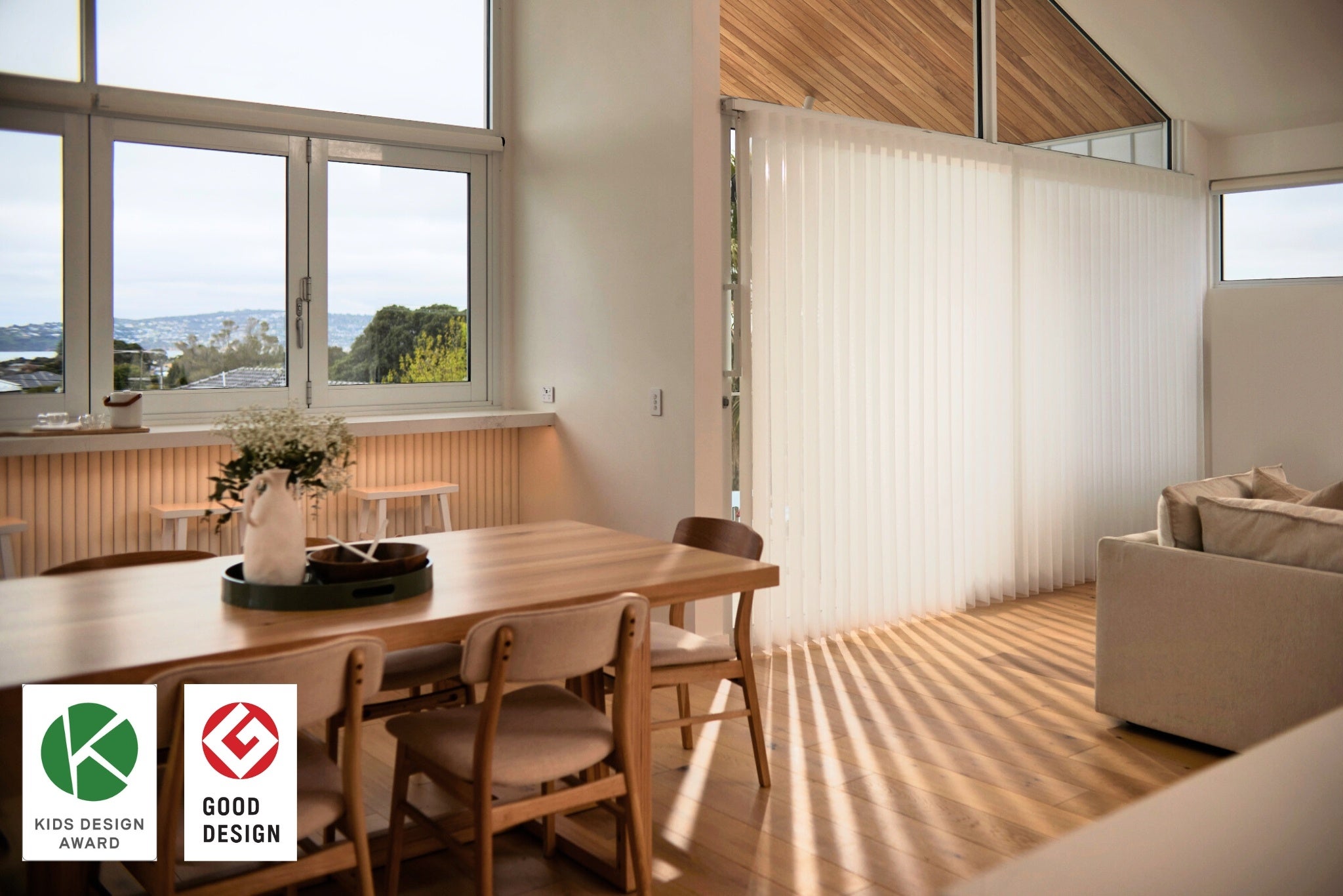カーテンの魅力である生地の柔らかな透け感やヒダが生み出す立体的な質感と、バーチカルブラインドの機能性を併せ持ったNORMANを代表する人気製品です。ブラインドレベルの調光性能のほか、汚れた生地だけ外して洗える、どこからでもウォークスルーできるといった実生活でも利便性を実感できる機能が、お客様から評価されています。