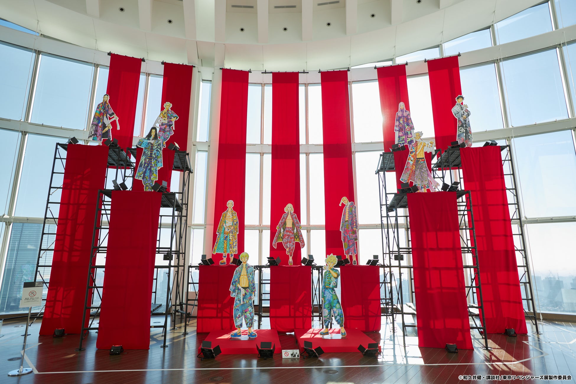 本展入り口には、和久井健先生が本展のために描き下ろしたカラーイラストの等身大パネルを週刊少年マガジンの巻頭カラー見開きをイメージして設置。11人がレッドカーペットのような壇上でお出迎えし、夜にはライトアップもされる圧巻のフォトスポットです。また、花垣武道(タケミチ)と佐野万次郎(マイキー)の色鮮やかな等身大衣装を展示いたします。