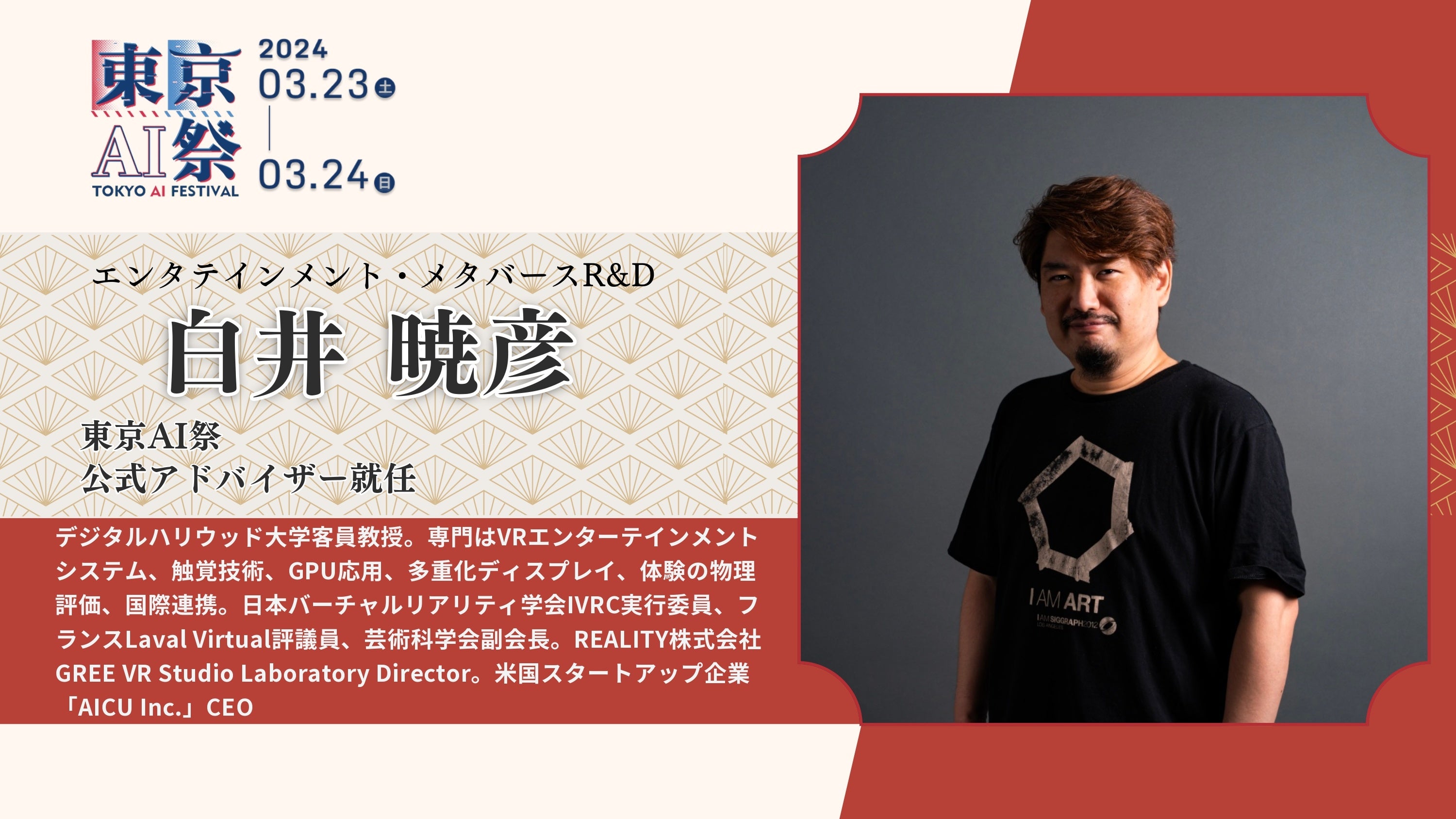 その東京AI祭において、参加者や来場者が熱狂するような「祭り」としてのエンターテインメント性をより一層高めるべく、VRエンターテインメントシステムの専門家であり、芸術科学会副会長、日本バーチャルリアリティ学会IVRC実行委員を務めるなど、次世代型のエンターテインメントを産業と学術を牽引する白井暁彦がアドバイザーに就任することをお知らせいたします。