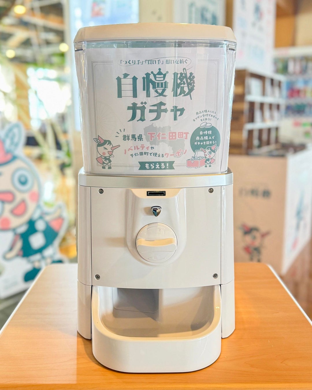 自慢機の隣にはガチャが設置されています。自慢機で商品を購入し、自慢機に掲示されているQRコードから自治体のアンケートに回答すると、NETSUGEN受付でガチャコインがもらえます。ガチャには自治体のノベルティや地域に訪問することで使えるクーポンなどが入っています。