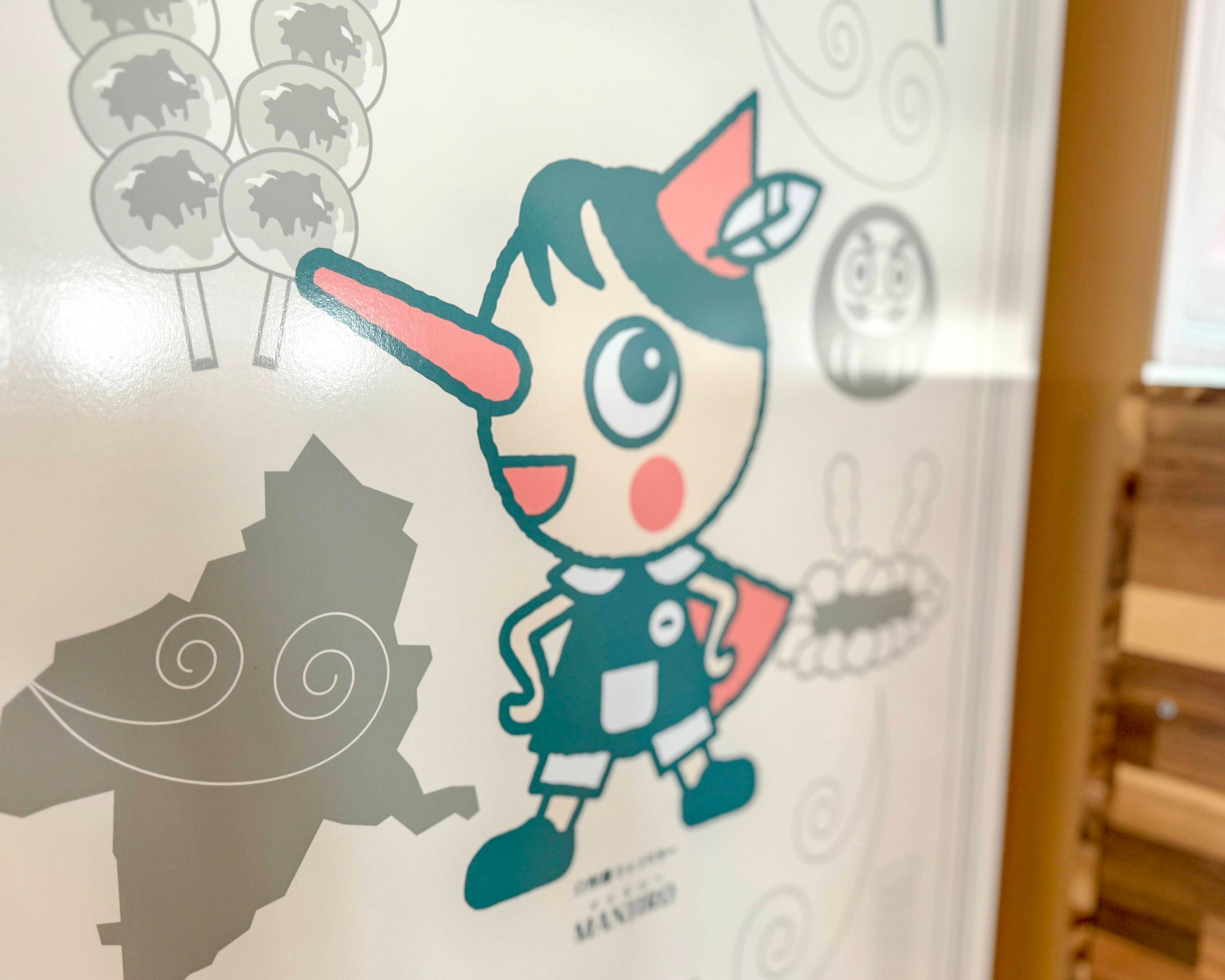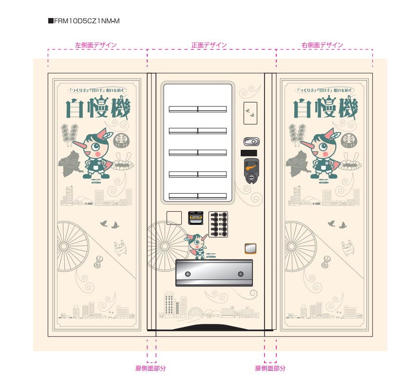 今回新たに自慢機をイメージとした「マンジロ―」というキャラクターを作成。この「マンジロー」は、群馬県のマスコットキャラクター「ぐんまちゃん」の作者、中嶋史子さんによって制作されました。マンジロ―は地域の商品を自慢する高い鼻を持ち、飛躍を連想させる羽とマント、自販機の要素を取り入れたコイン投入口のワッペンや取り出し口を模したポケットのある洋服を着ています。