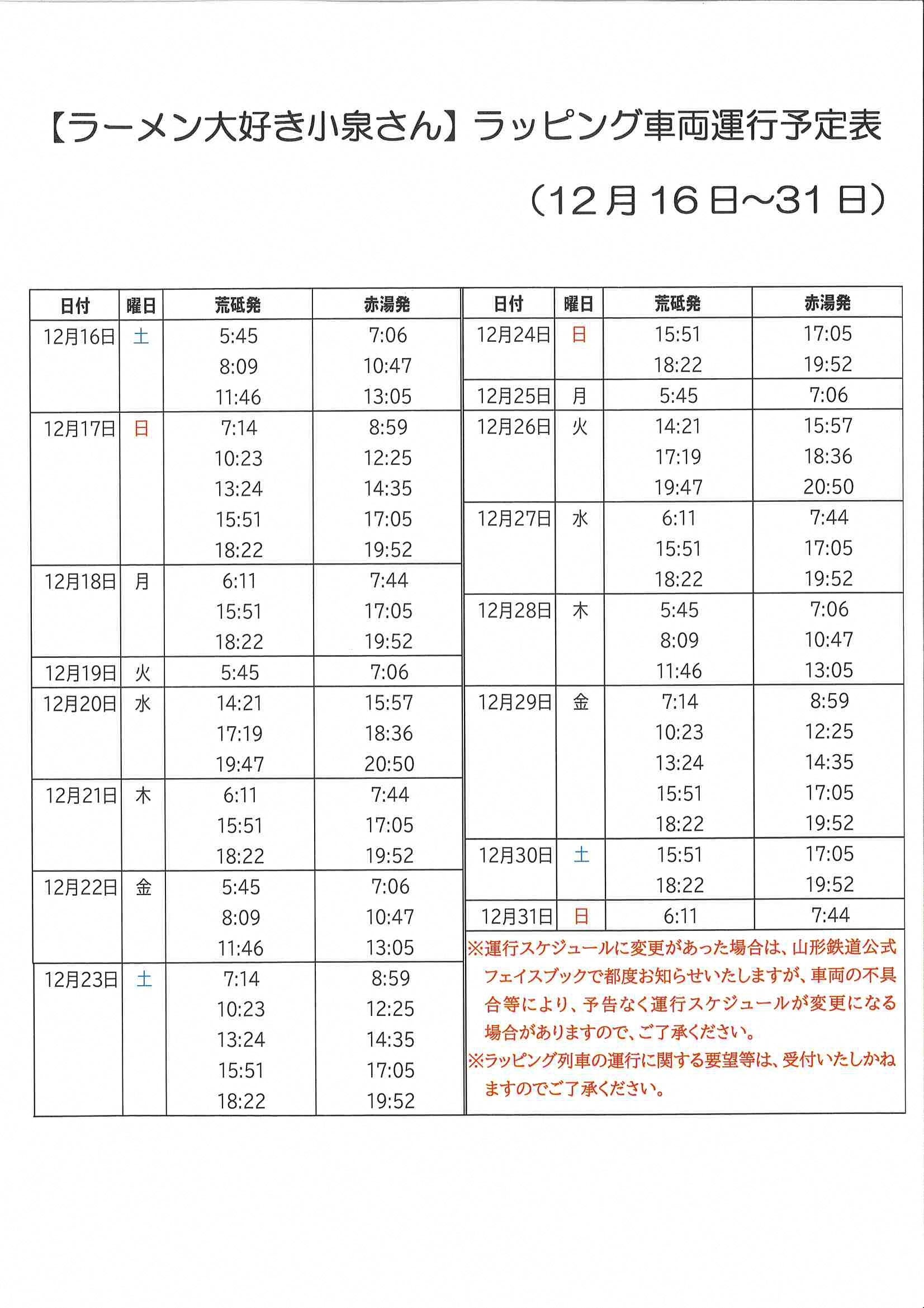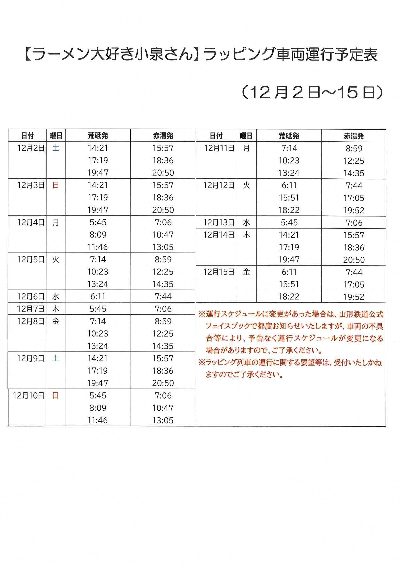 一般の方の乗車が可能な最初の便は、上り線が荒砥駅発14時21分、下り線が赤湯駅15時57分発。その後の運行スケジュールについては、山形鉄道の公式Facebookで公開されている。(運行スケジュールに変更があった場合も、その都度Facebookで案内される予定)
