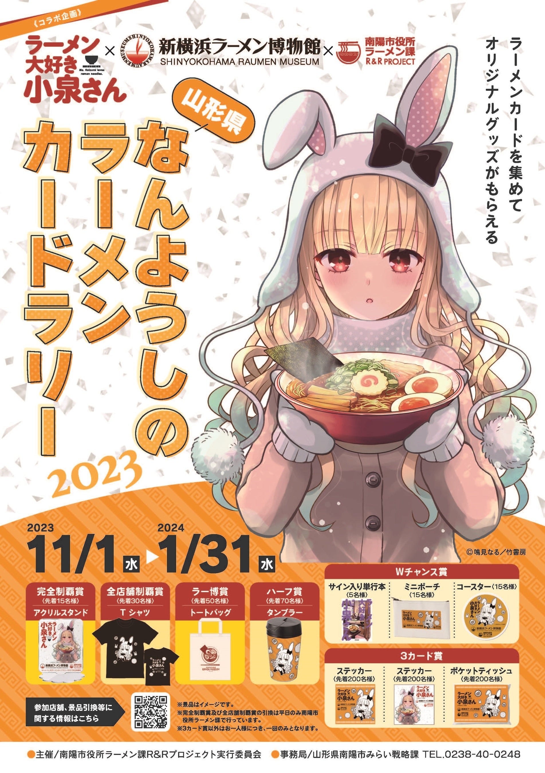 また、既に展開されているラーメンカードラリーとの連動企画も用意。カードラリー参加者は12月2日~1月31日のカードラリー期間中にフラワー長井線に乗車した場合、ラッピング列車イラストデザインの小泉さんオリジナルステッカーがプレゼントされる。