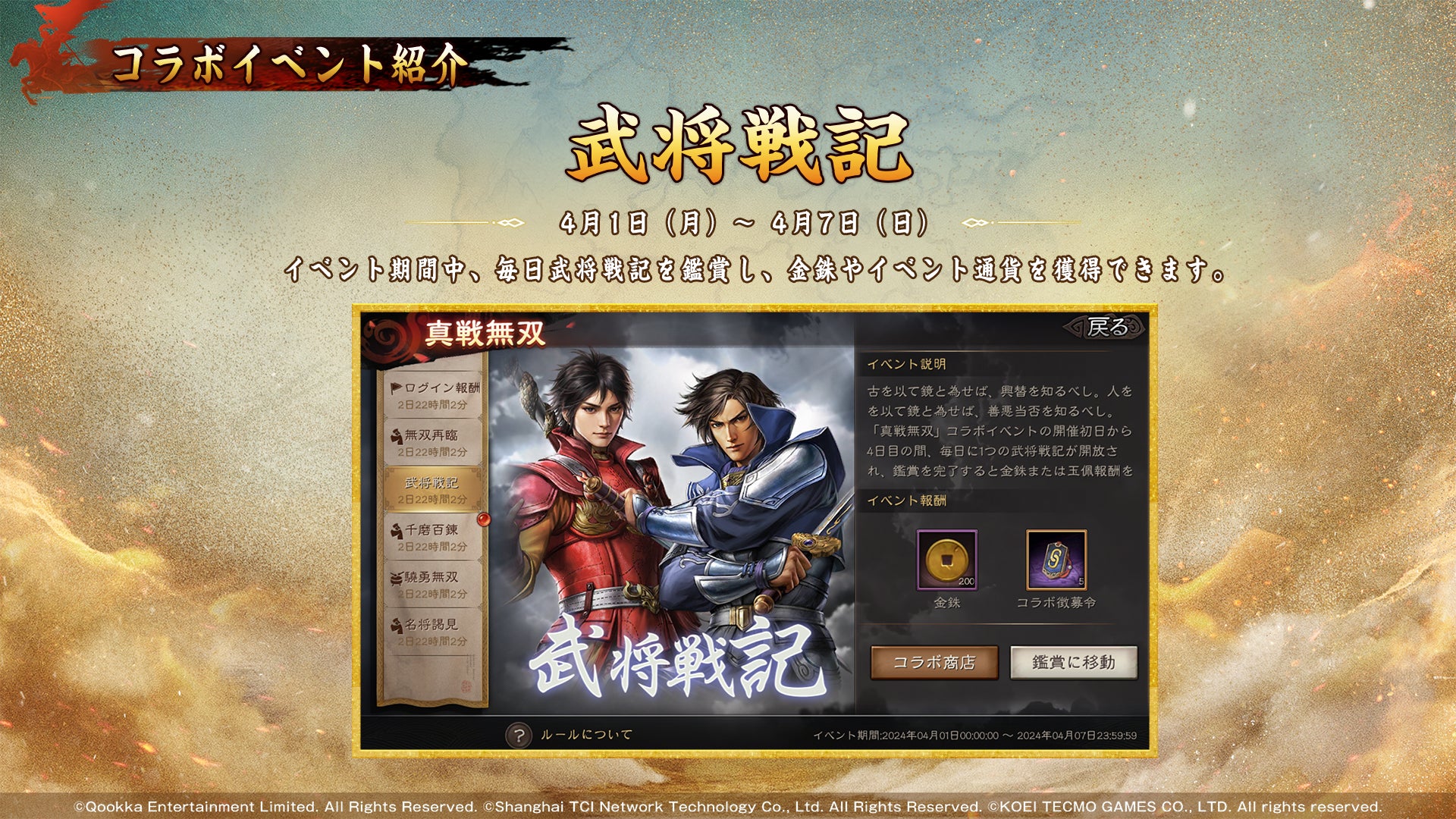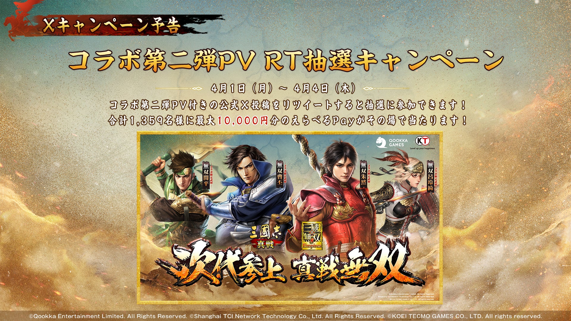 Qookka Entertainment Limitedは、株式会社コーエーテクモゲームスの歴史シミュレーションゲーム『三國志13』のIPを使用し、同社監修のもと開発されたスマートフォン向けゲームアプリ『三國志 真戦』において、コーエーテクモゲームスの人気タイトル『真・三國無双8 Empires』とのコラボイベント第二弾を2024年4月1日から実施することを決定いたしました。3月15日配信の『三國志 真戦』公式生放送にて本情報を解禁いたしました。