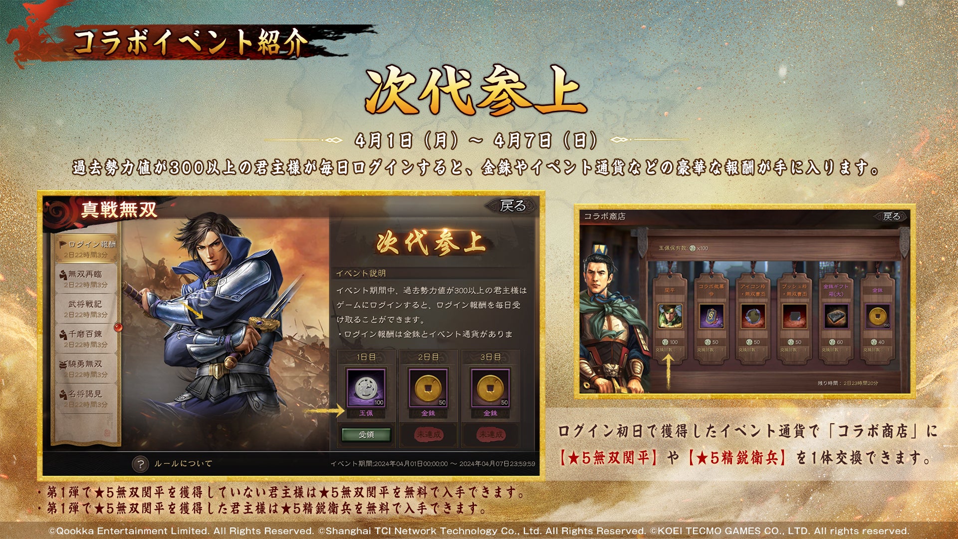 1)次代参上(4月1日~4月7日):イベント期間中、過去勢力値が300以上の君主様は、ゲームにログインすることでログイン報酬を毎日受け取ることができます!イベント参加で☆5無双関平、コラボ限定10連ガチャを無料ゲット!(☆5無双関平について、コラボ第一弾で獲得していないプレイヤーのみ無料で獲得することが可能、獲得済みのプレイヤーは☆5精鋭衛兵を得ることができます。)