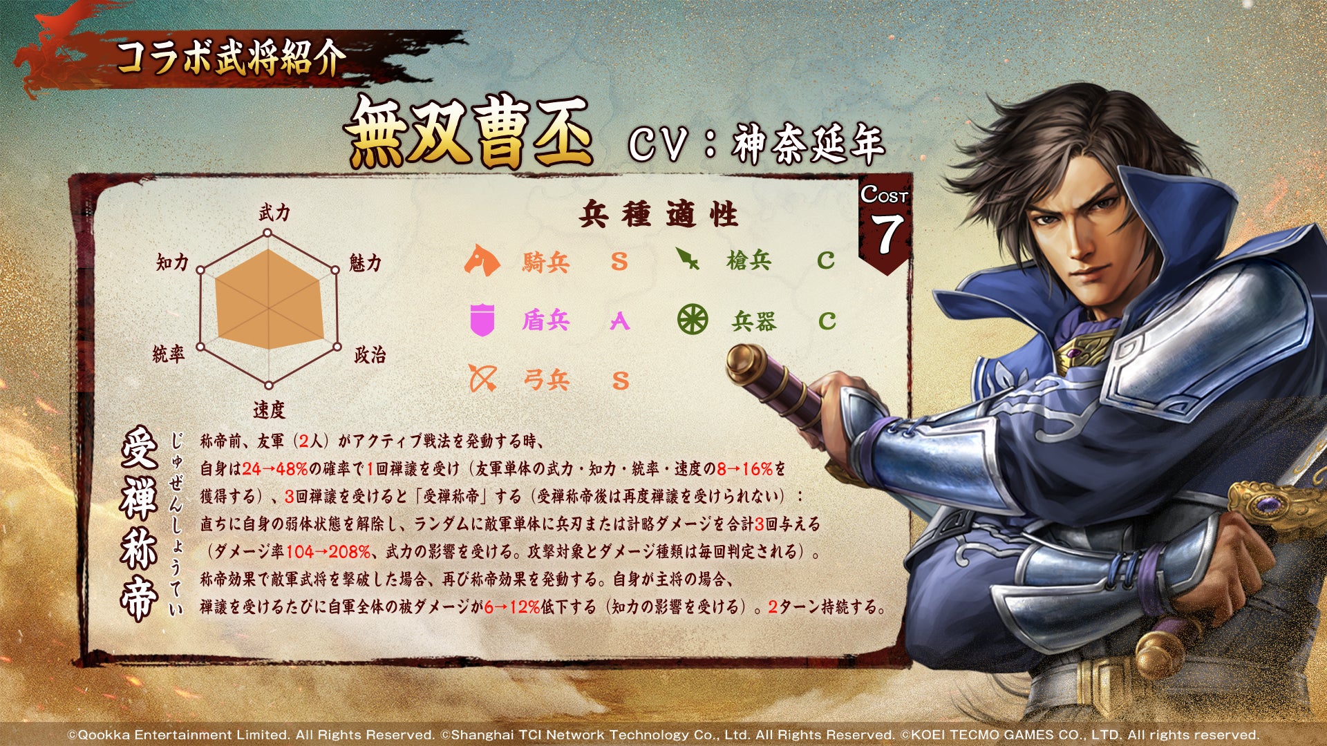 コストは7の武将。武力、知力、統率など、戦いに関するほとんどの属性値が高い優秀な武将。固有戦法は「受禅称帝」。