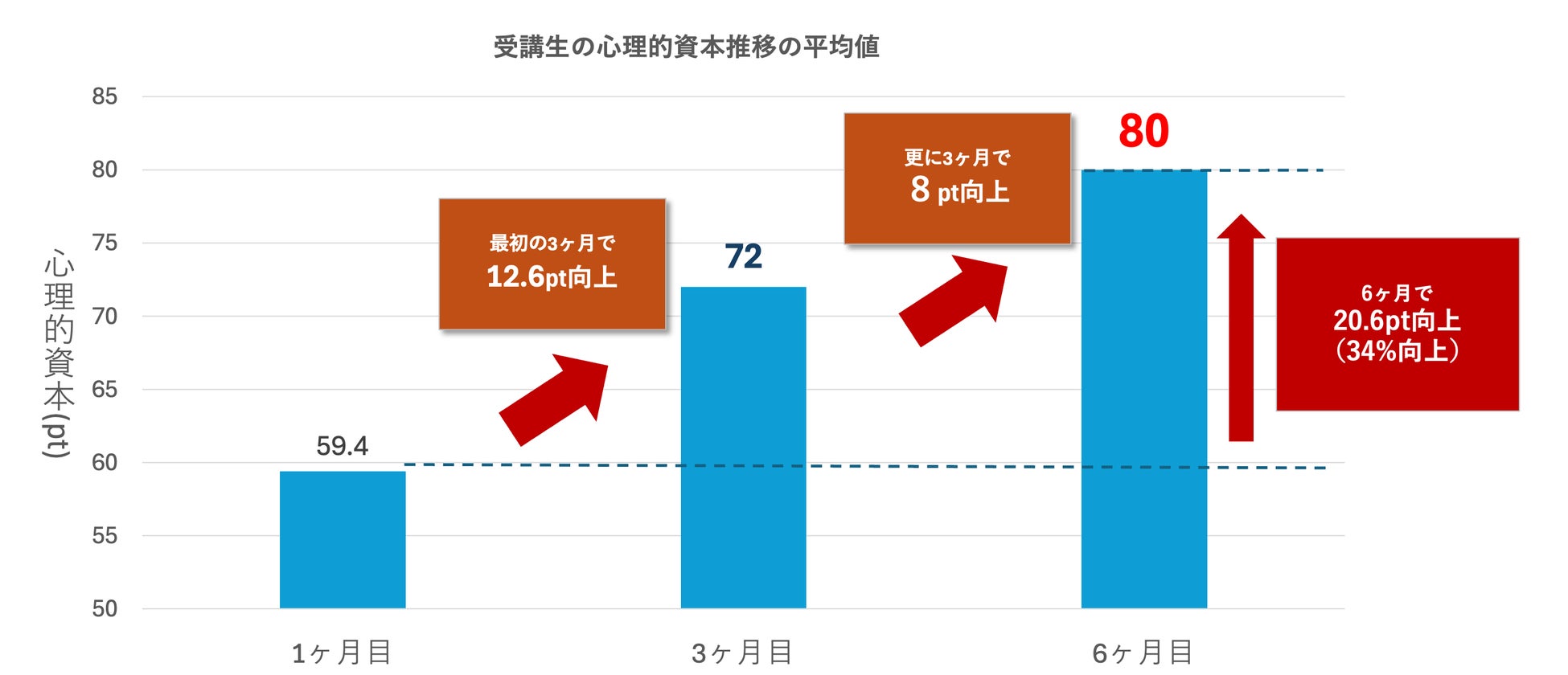 ・受講生平均、受講6ヶ月間で心理的資本数値が34%向上