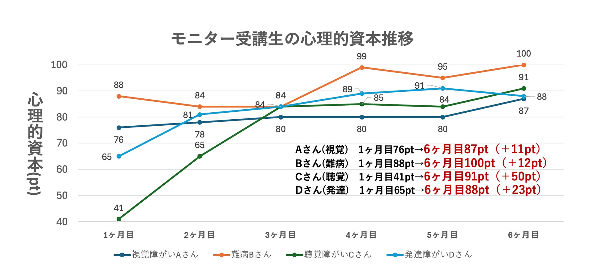 ・視覚障がい、難病、聴覚障がい、発達障がいの4種の異なる障がい特性を持つ受講生に共通して、受講開始3ヶ月目で高水準の80に到達し、その後6ヶ月目まで高水準を維持しています。