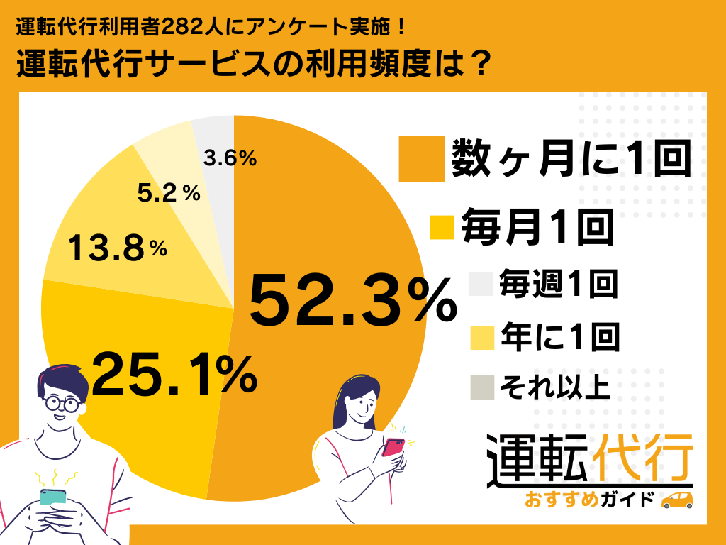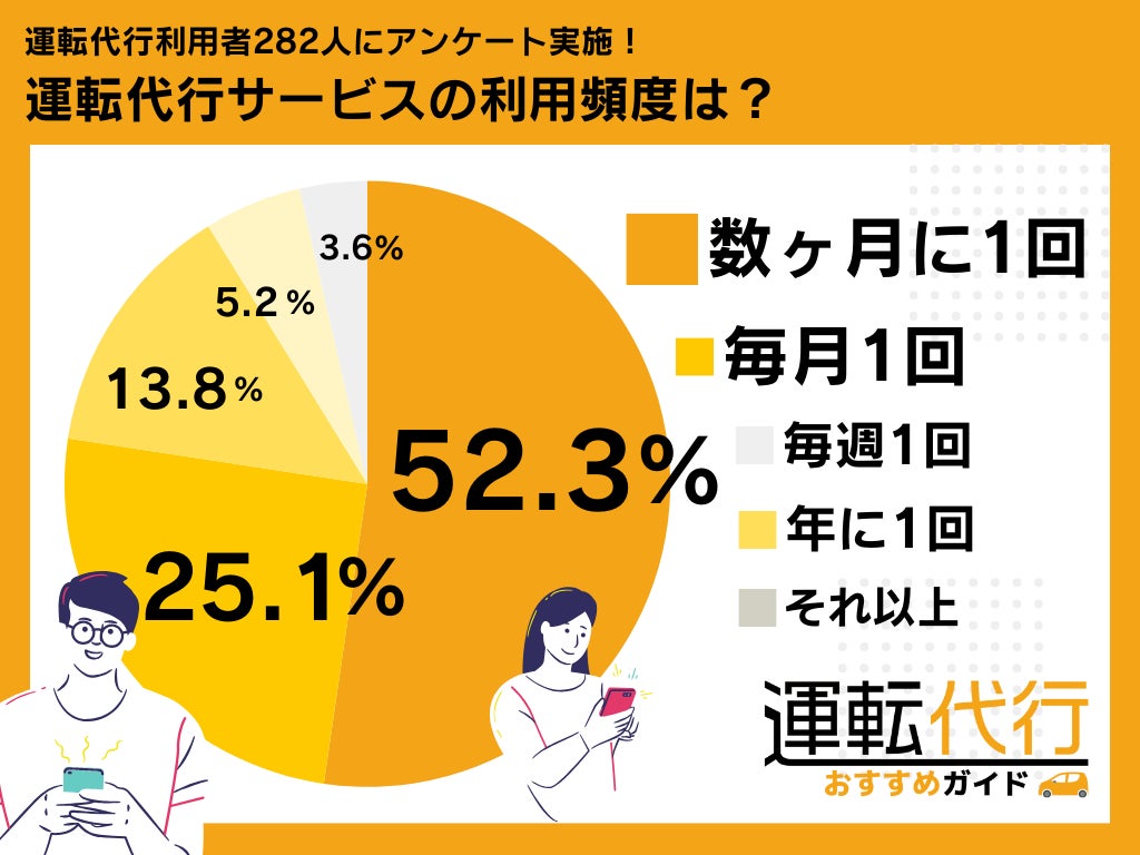 運転代行合同会社(本社:東京都中央区銀座一丁目12番4号、代表取締役:小林尚貴)が運営する運転代行ポータルサイト「運転代行おすすめガイド」は、運転代行利用者282人を対象に、運転代行業者の利用頻度とその満足度について調査・分析いたしました。