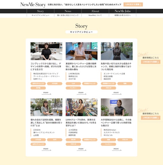 メディアに出てくる「バリキャリ」「キラキラ」な先輩は、あまりにまぶしくて自分とは違うと感じてしまいがち。一方で日頃接する近い世界の先輩は、環境も近いが故にどうしても体験談が似通ってしまいがち。NewMeが提供したいのは「遠すぎず、近すぎない」今まで日々働く中では出会いづらかった先輩たちとの接点。その中の誰になる必要もない、多様な働き方のヒントの中から自分らしいキャリアのための「良いとこ取り」ができる機会を提供するのが「NewMe Story」です。「自分の人生を自分でハンドリング」している女性たちにフォーカスし、独自取材を通じて多様な働き方・生き方を紹介することで、自分の働き方・生き方に悩む20-30代の女性が一歩踏み出すきっかけを創ります。