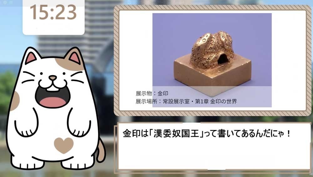 AIキャラクター:「おすすめの展示品はたくさんあるんだけど、やっぱり国宝の「金印」は見てほしいにゃ! 小さいのに、昔の中国と日本のつながりがわかる、すごーく大切なものなんだ!」