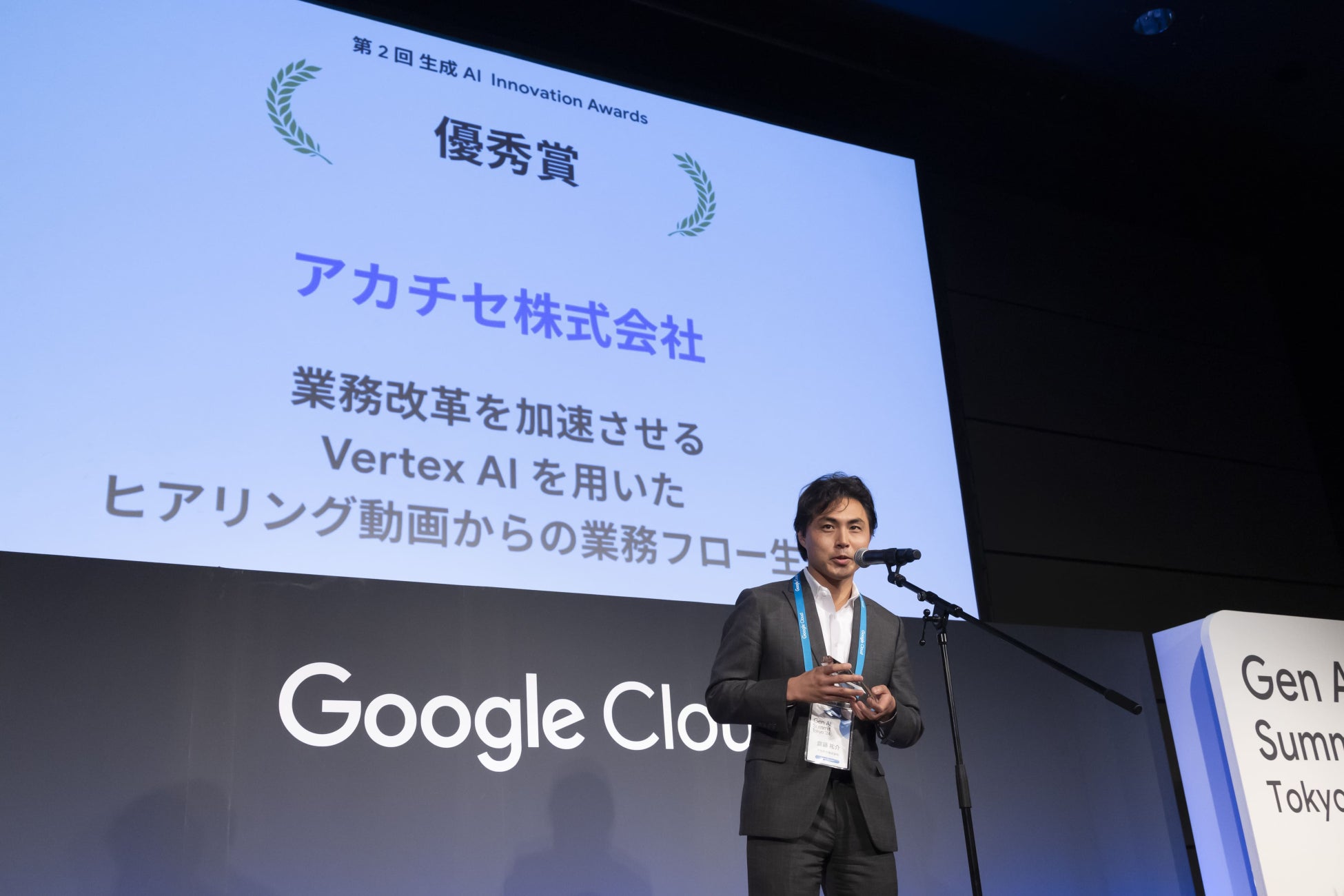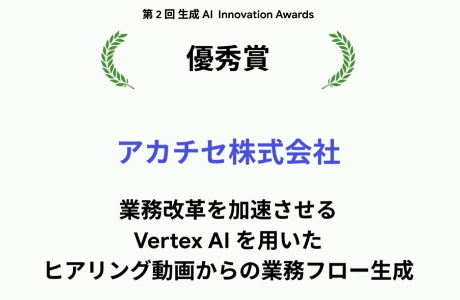 「生成AI Innovation Awards」は、Google Cloudの生成AI技術を活用した企業の革新的な取り組みを表彰し、未来の可能性を探る場として今回で2回目の開催となるアワードです。アカチセは、会議の動画を生成AIで分析し、業務フローを自動生成する取り組みが評価され、国内の企業、スタートアップ、研究機関、教育機関、自治体等、100社以上の応募の中からファイナリストとして同カンファレンスに登壇。この度、優秀賞を受賞しました。
