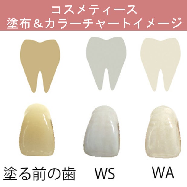 今回新発売の「コスメティースWS」、「コスメティースWA」の両商品は、歯に液剤を塗ると、速乾して瞬時に歯を白くメイク(ホワイトメイク)します。さらに液剤は歯を被膜するため、汚れが歯の表面に付着するのを防ぐ(ホワイトキープ)と共に、使用後ブラッシングで落とす際に、歯の表面の汚れも吸着除去(ホワイトケア)します。