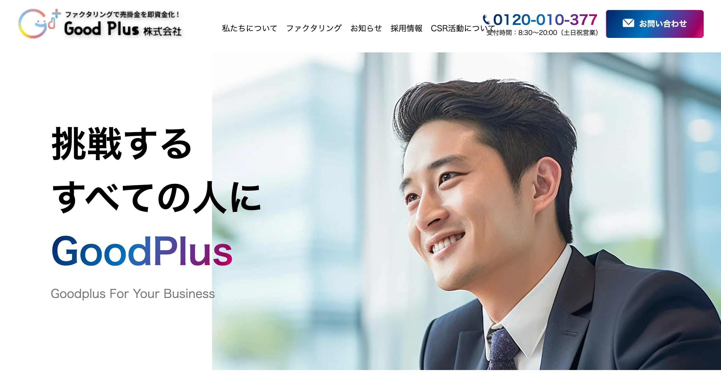 GoodPlus株式会社では「挑戦するすべての人にGoodPlus」をビジョンに、事業経営に関わる法人、個人事業主の方々へファクタリングサービス及び、資金繰り改善コンサルティングを提供しております。
