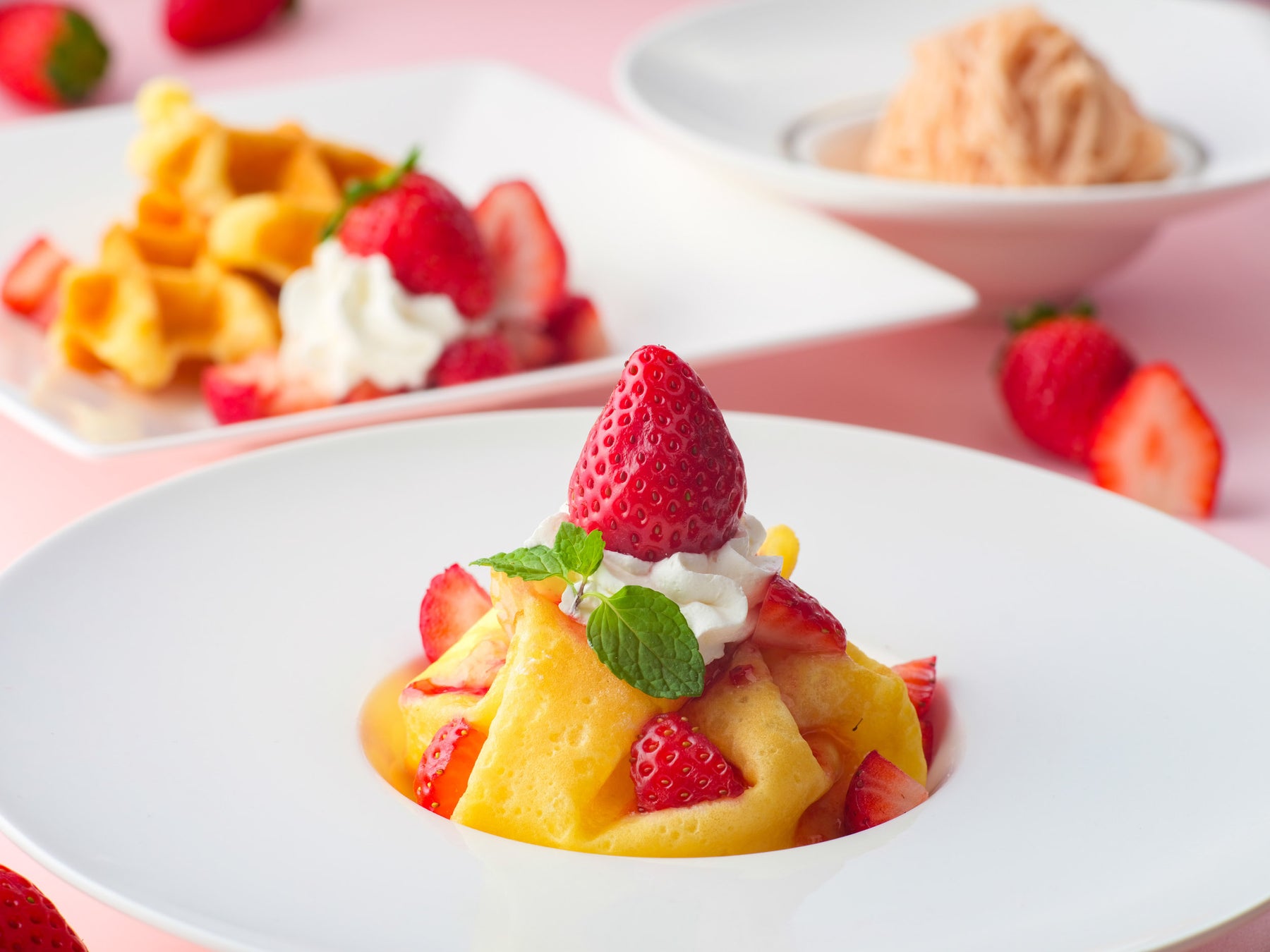 3.ソースやクリームをセルフで楽しく盛り付ける「いちごワッフル」