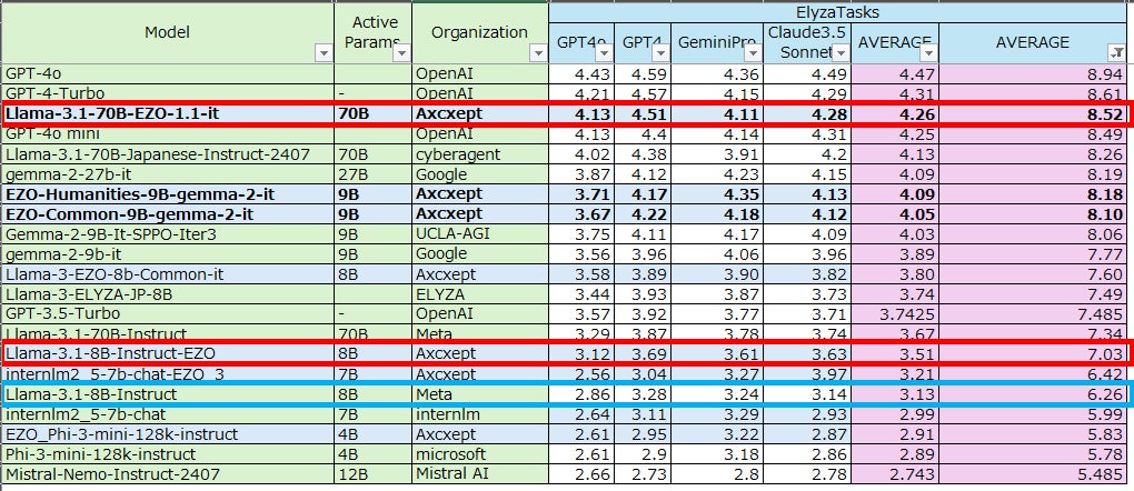 EZOシリーズの最新モデルは、Llama-3.1-70Bをベースに日本語処理能力を飛躍的に向上させ、ElyzaTasksにおいてgpt-4o-miniを上回るスコアを達成しました。また、8Bの軽量モデルでも、ベースモデルの性能を大幅に向上させることに成功しています。