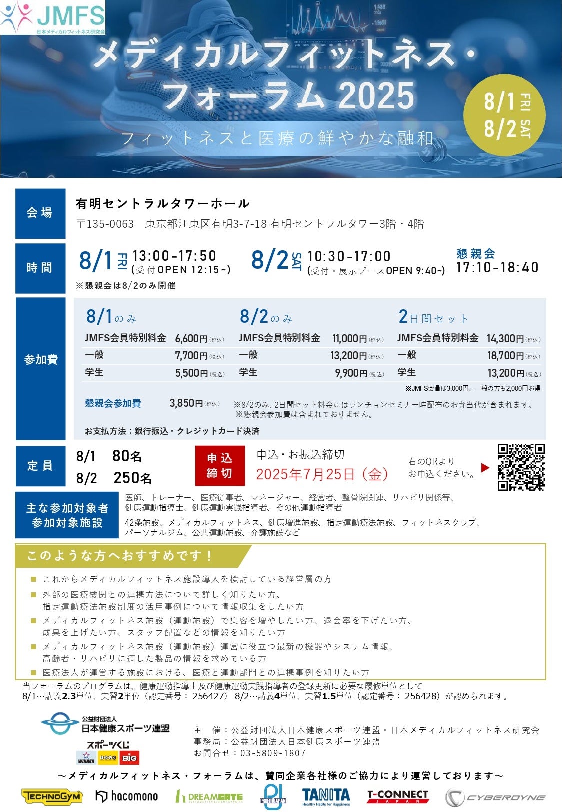 公益財団法人日本健康スポーツ連盟・日本メディカルフィットネス研究会は、メディカルフィットネス業界の更なる普及・発展を目的に「メディカルフィットネス・フォーラム2025」を8月1日(金)~8/2(土)に開催いたします。