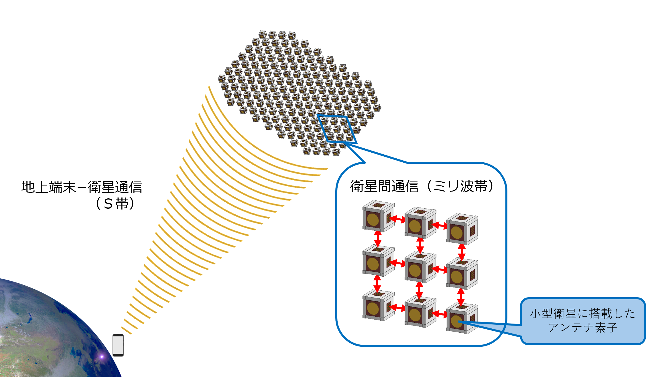 本研究開発では、アンテナ素子を搭載した多数の小型衛星を軌道上に打ち上げ、その小型衛星を宇宙空間上にて位置と姿勢を制御し、大口径のフェーズドアレイアンテナを構築するためのアンテナ技術を確立することを目的としております。これにより、スマートフォンをはじめとした、高機能のデバイス等の地上端末と直接通信を実現し、新モビリティ社会へのさらなる発展に寄与したいと考えております。