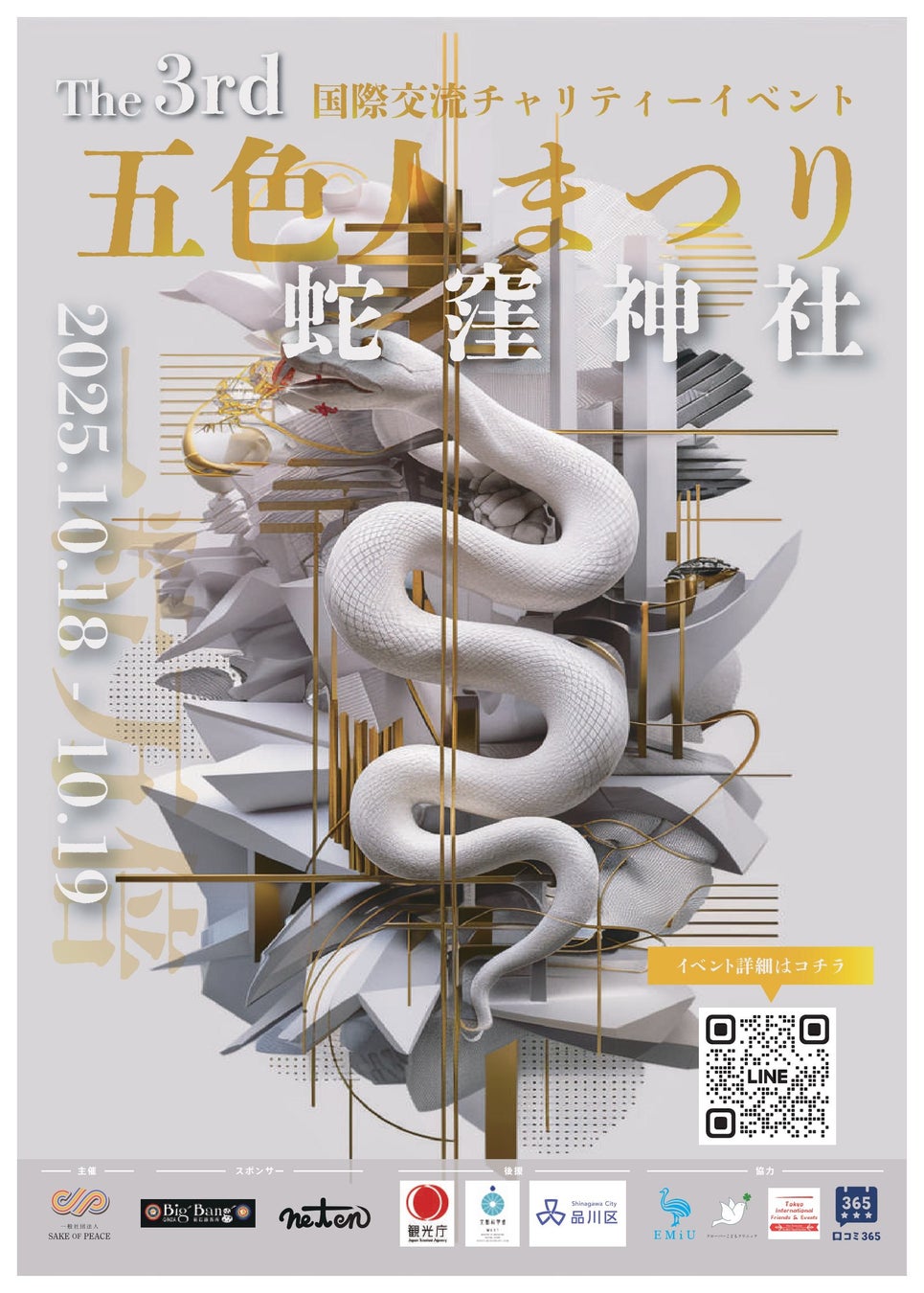 一般社団法人 SAKE OF PEACE(セイク オブ ピース/本社:中央区銀座,代表理事:KAZ ) は、2025年10月18日(土)・19日(日)の2日間、東京都品川区の蛇窪神社(白蛇さまの神社)にて、「第3回 五色人まつり&KIDS SCHOOL」を開催いたします。本イベントは、“祈りと平和をつなぐ祭典”をテーマに、子どもたちが文化や言葉の違いを越えて学び合い、地域・家族・世界を結ぶ教育と多様性の祭典です。今年は巳年にちなみ、「再生と繁栄の象徴」である白蛇を祀る蛇窪神社を舞台に、学び・芸術・祈りが融合した国際チャリティイベントとして開催されます。