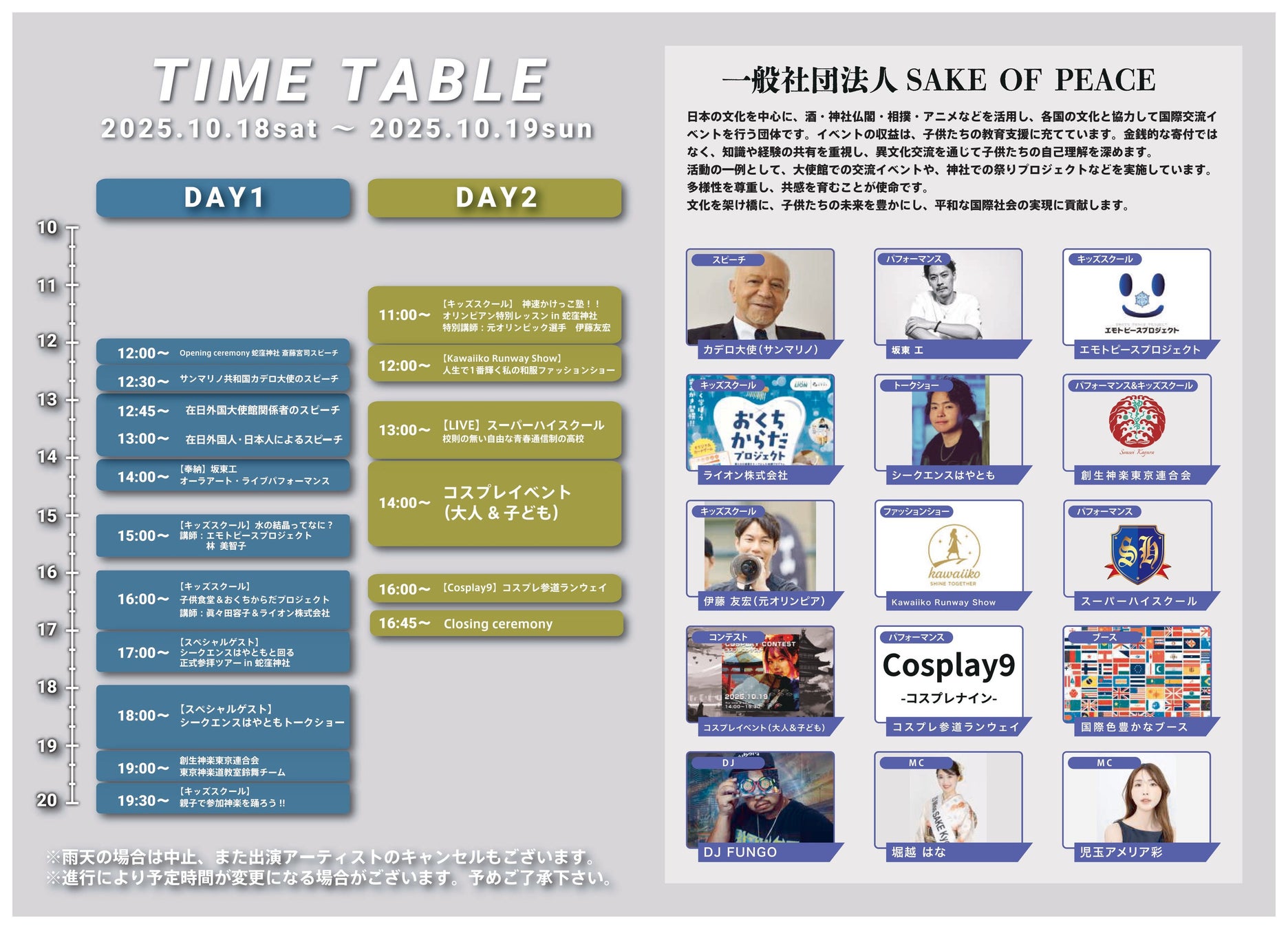 日時:2025年10月18日(土)12:00〜20:00, 2025年10月19日(日)11:00〜17:00 会場: 蛇窪神社(東京都品川区二葉4-4-12),入場料: 無料 主催: 一般社団法人 SAKE OF PEACE: メインスポンサー: BIG BANG 隕石直売所/neten株式会社後援: 観光庁/文部科学省/品川区 :協力: 蛇窪神社/EMIU/クローバーこどもクリニック/TOKYO INTERNATIONAL FRIENDS AND EVENTS/口コミ365