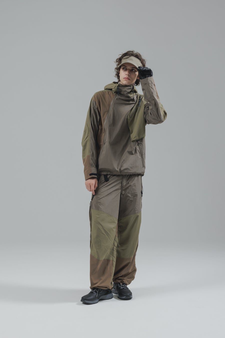 【アノラック / Packable ANORAK】とセットアップできるボトムス。アウター同様、撥水性のある3つの素材を組み合わせた立体感のあるデザイン。脇のファスナーで裾の太さ調整が可能。背面のポケットに本体を収納できるパッカブル仕様。¥39,600 tax in