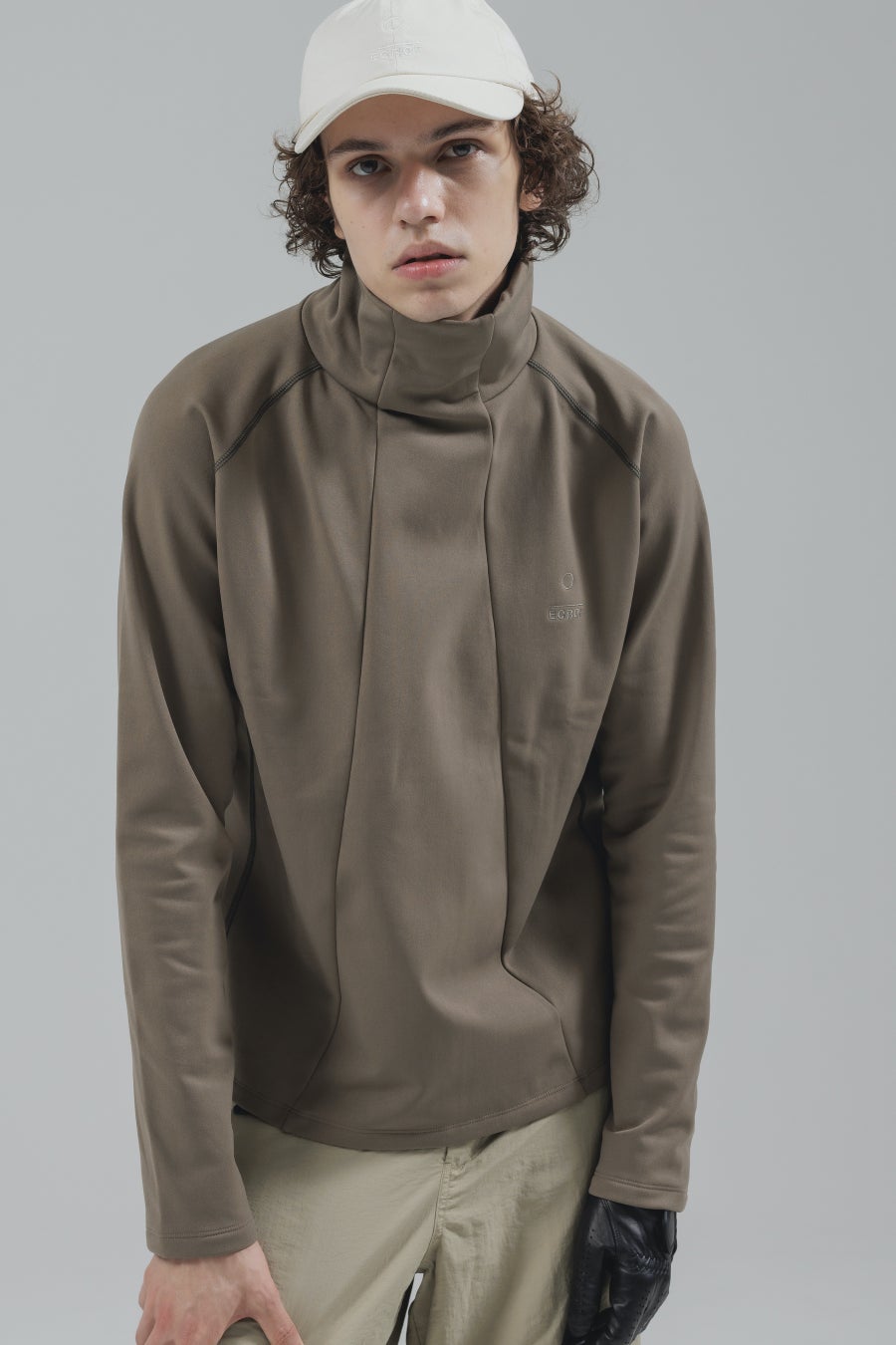 保温性と伸縮性に優れたオフタートルの長袖カットソー。高めのネックなのでゆとりがあり、折り返しての着用も可能。¥19,800 tax in