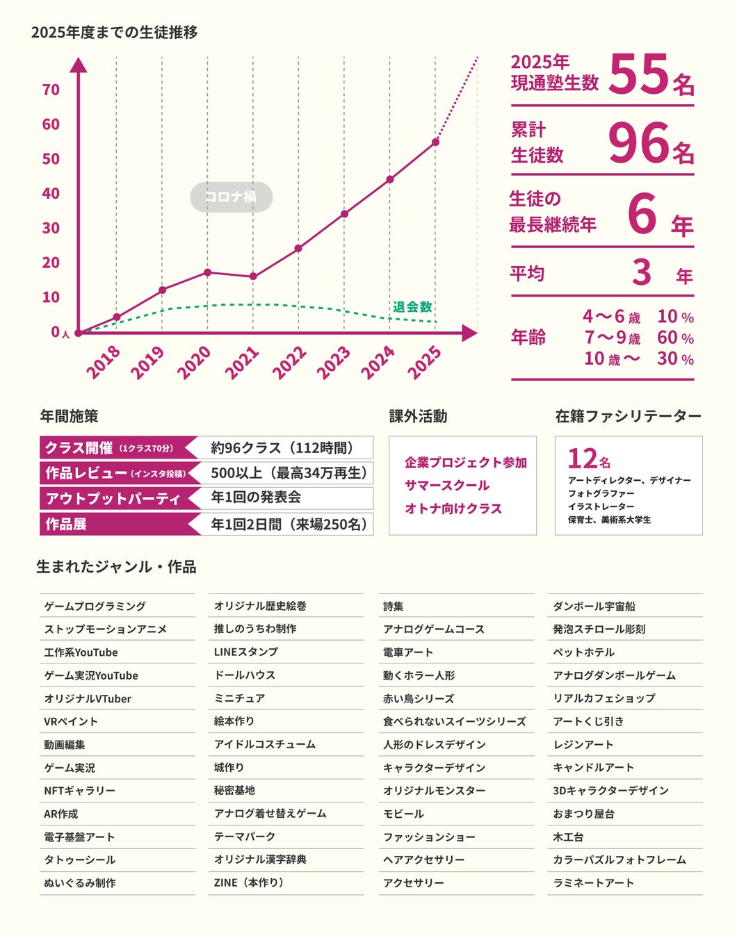 これまでに約500クラス(約590時間)が開催され、96名の子どもたちが、イラスト・工作・ぬいぐるみ・アニメーション・YouTube・NFTアートなど、50種類以上のジャンルの作品を生み出しています。