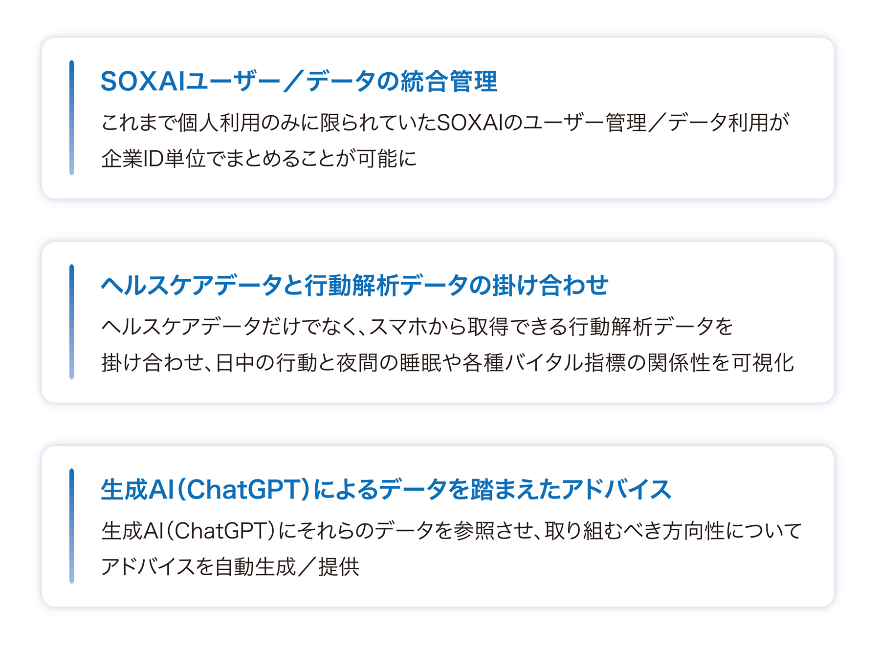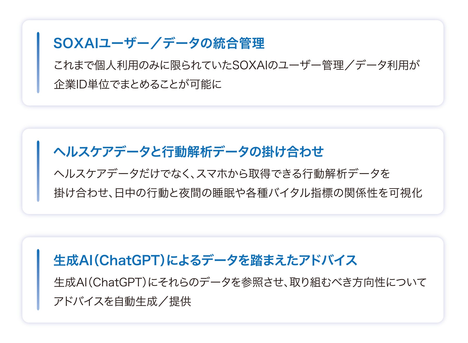このたび、リアライズ・イノベーションズの行動解析技術とSOXAIが持つヘルスケアデータを組み合わせた行動変容型のヘルスケアソリューションを、健康増進サービスの開発に取り組む企業向けに展開します。このソリューションの提供により、企業がヘルスケアデータと連携する保険商品や、エンドユーザー生活習慣に合わせてカスタマイズした新しい行動変容サービスなどを開発する支援を行います。具体的には、企業がバイタルデータや睡眠データ、さらに行動データを基にChatGPTを活用し、アプリケーションを介してサービスの利用者向けに日次で健康に関するアドバイス※2を行い、可視化されたヘルスケアデータを提供します。これにより、サービスの利用者は健康意識を日常的に高めるとともに、サポートを受けながら自らの行動を改善していくことが可能になります。例えば、午前中に日光を浴びながらウォーキングなどの有酸素運動をすることは、体内時計をリセットして睡眠のリズムを整える効果があることが各種の研究※3や調査で明らかになっていますが、行動解析技術によって午前中に該当する行動があったのかを踏まえてアドバイスを受けることができ、アドバイスによって行動が変容された場合にその変化を捉えることも可能です。また、利用者は行動を変えることで得られた効果を確認することができ、生活習慣を改善するモチベーションにつながることが期待されます。