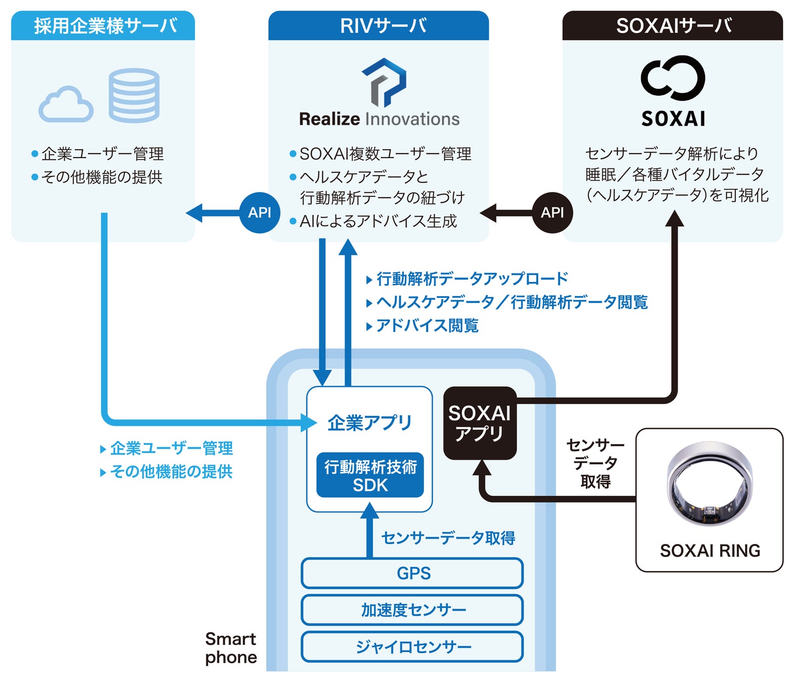 リアライズ・イノベーションズは、パートナー企業と共にAI(人工知能)を活用した行動解析技術を提供しています。スマートフォンから得られるデータをAIで解析することで、利用者の滞在場所や移動手段の推定、行動パターンの抽出による行動予測や行動特性の診断などに活用されています。SOXAIは、利用者のバイタルデータや睡眠データを高精度で簡単に測定できるスマートリング「SOXAI RING」を提供しています。SOXAIは、2022年に「SOXAI RING」の初期モデルを発表した後、2023年7月には新モデルを展開しており、販売開始から1年以内に数億円規模の売上を達成しています。また、SOXAIは、スマートリング「SOXAI RING」を通して得たデータを基に作成したAPIを公開しました。企業は、このAPIを基に、より具体的な健康増進サービスを考案することが可能になります。