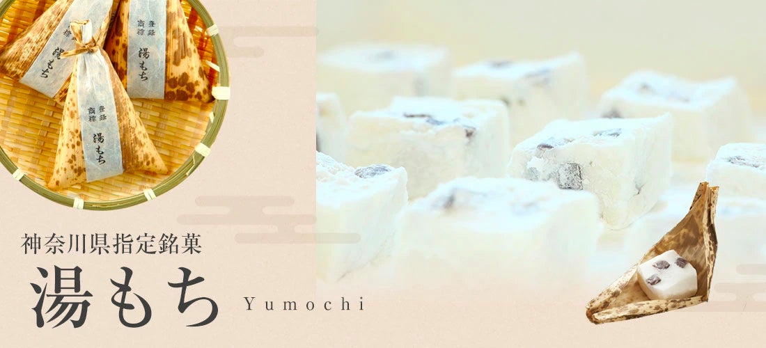 国産の白玉粉を練り上げたやわらかいお餅の中にやさしい甘さの羊羹を切り入れ、柚子のほのかな香りをもって蜜柑の里らしく、竹皮で旅の風情をお伝えする、箱根を代表する銘菓です。従来、湯もちはその風味を保つ保存性や持ち運びのために竹皮に包まれてきました。