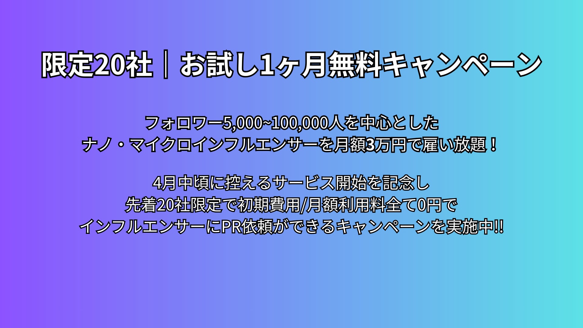 ナノ・マイクロインフルエンサーを月額3万円で雇い放題で企業の成長を促進!PRをしたインフルエンサーには特典をつけることでインフルエンサー活動にも貢献します。