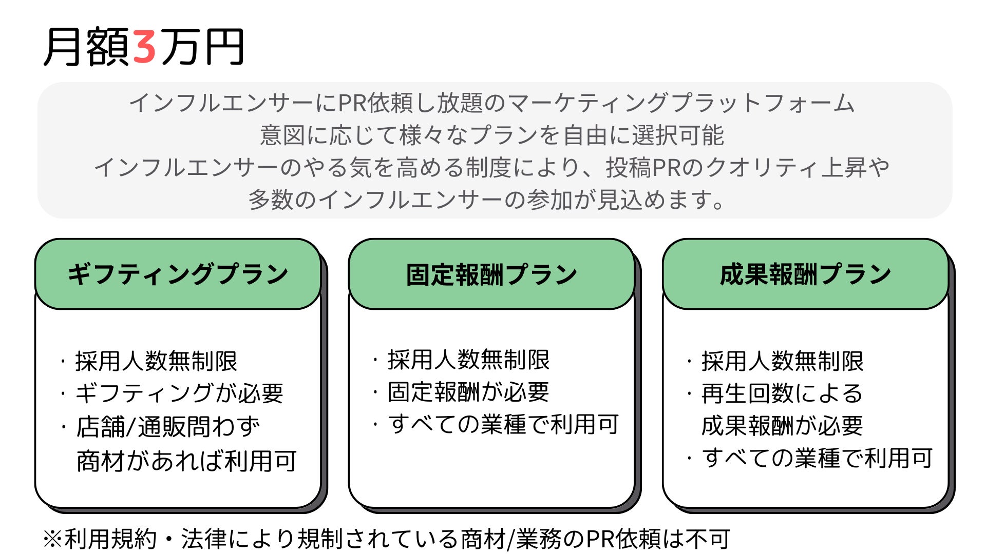 →月額3万円でインフルエンサーを雇い放題/より多くのインフルエンサーがPR活動を行える環境を構築