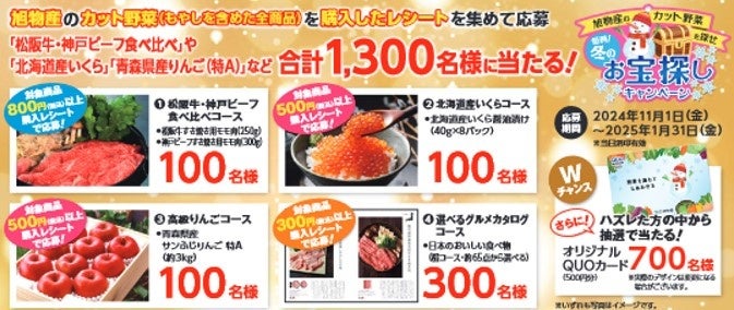 関東を中心にカット野菜やもやしを製造販売し、2021年に創業50周年を迎えた株式会社旭物産(本社:茨城県水戸市/代表取締役社長:林 正太郎、以下 当社)は、2024年11月1日(金)から2回目を迎える大型消費者キャンペーン「旭物産のカット野菜を探せ 恒例!冬のお宝探しキャンペーン」を実施いたします。前回に引き続き、当社が加工者、生産者、販売者として販売している全商品を対象とします。