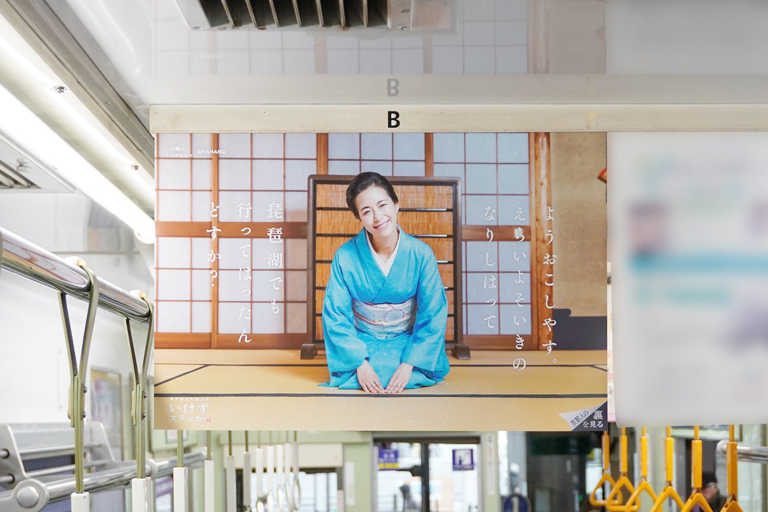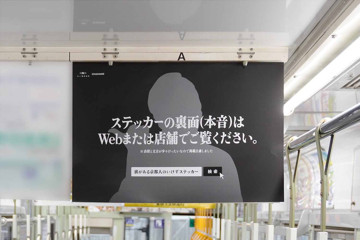 ステッカーでは裏面に本音が描かれていますが、文言とモデルの表情が嵐電の車窓から見える美しい景観とはマッチしないと考え、中吊り広告では掲載を自主規制しました。