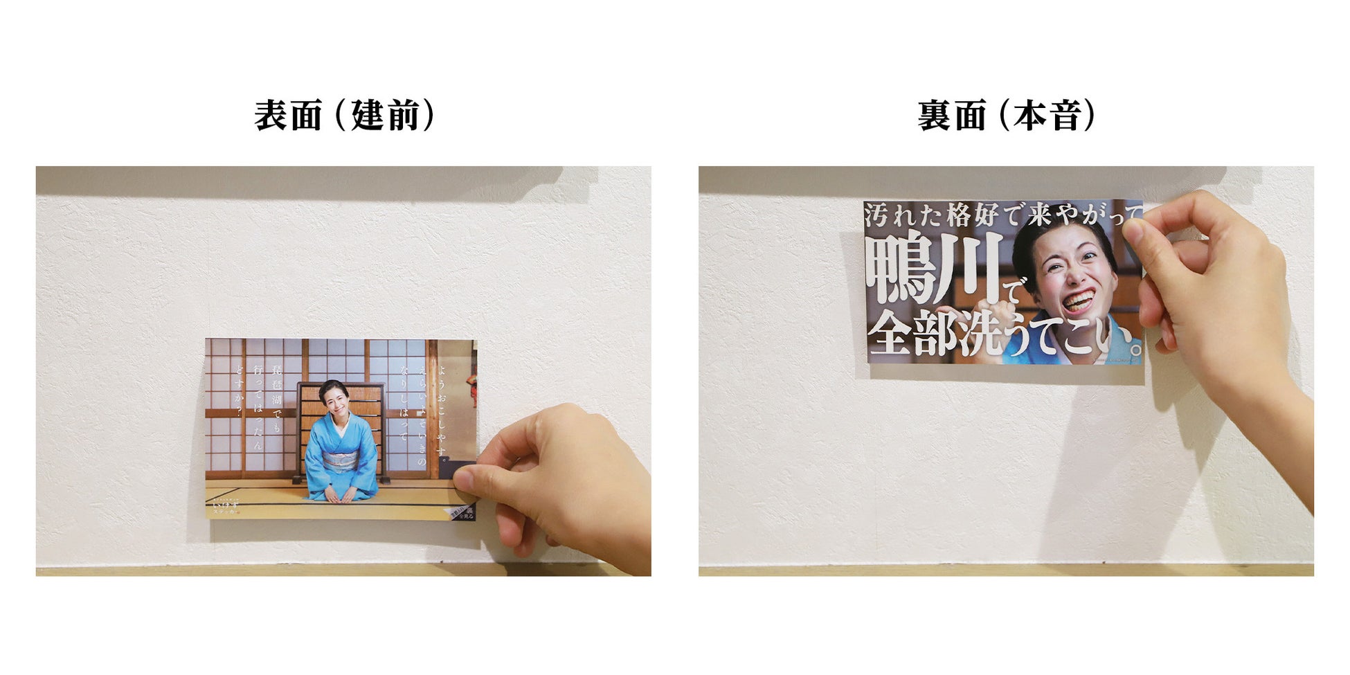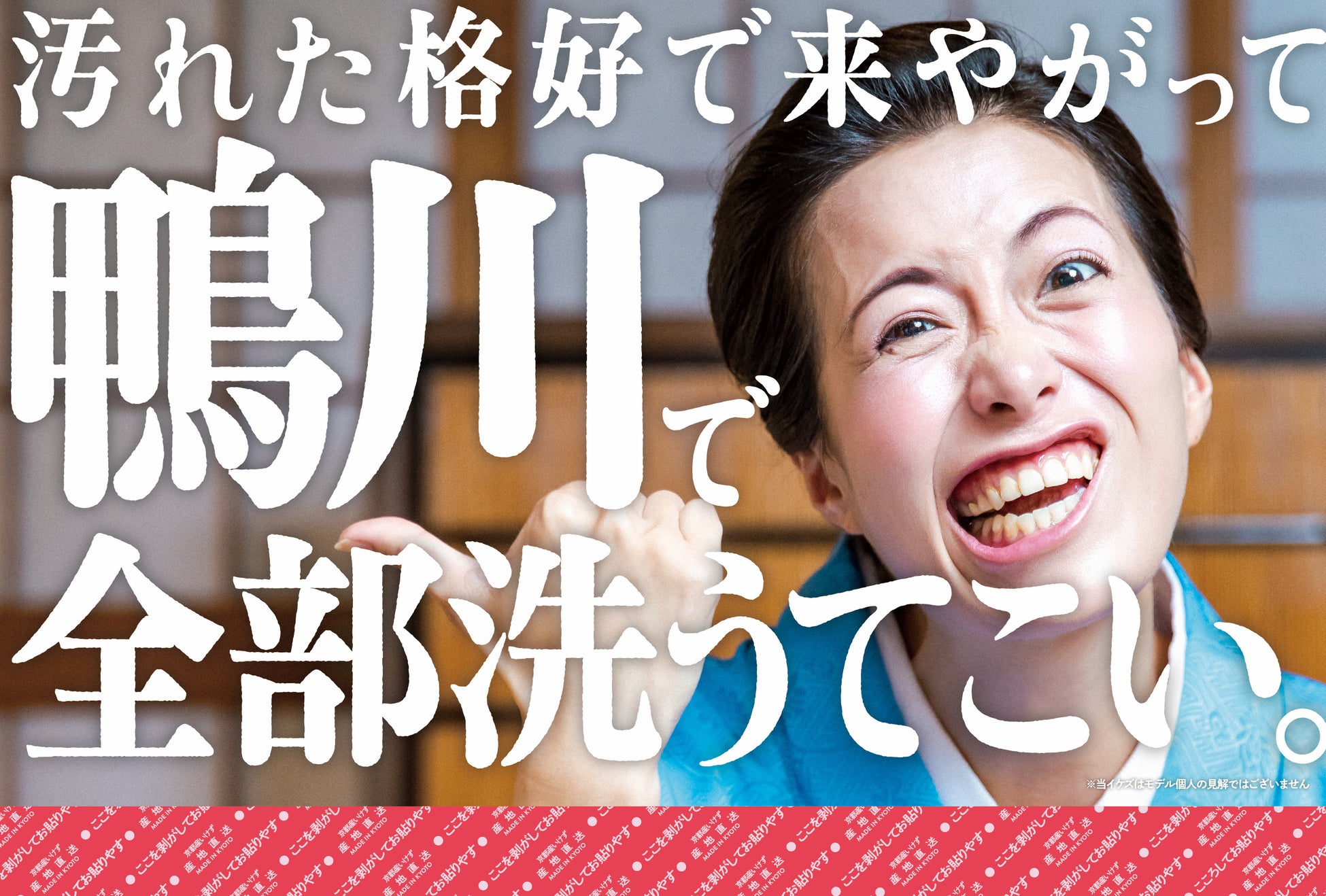 広告に掲載された「ようおこしやす。えらいよそいきのなりしはって琵琶湖でも行ってはったんどすか?」というメッセージはあくまで建前で、その裏には「汚れた格好で来やがって。鴨川で全部洗うてこい。」という本音が隠れています。