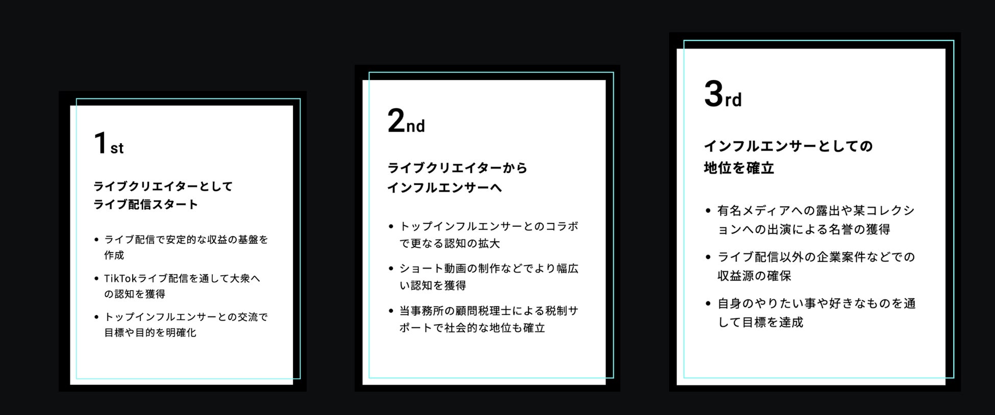 当事務所ではライブ配信は成功への一つのきっかけとして考え、ライブ配信を通じて成長し、ライブ配信による投げ銭だけでなく、広告収入や企業からのPR案件の獲得、さらにはクリエイター自身のブランドや商品を展開することによる、収益の多角化ができるようサポートすることを前提として運営を行います。